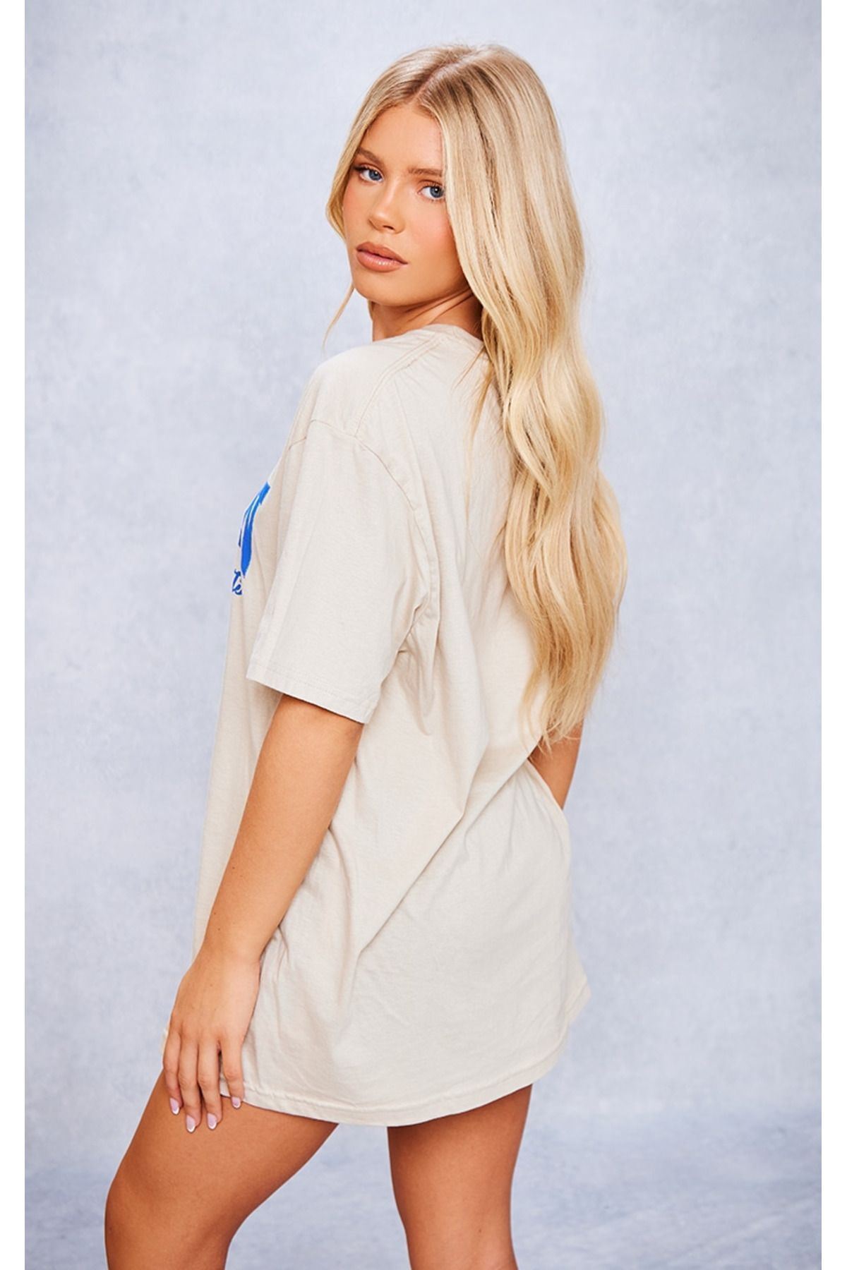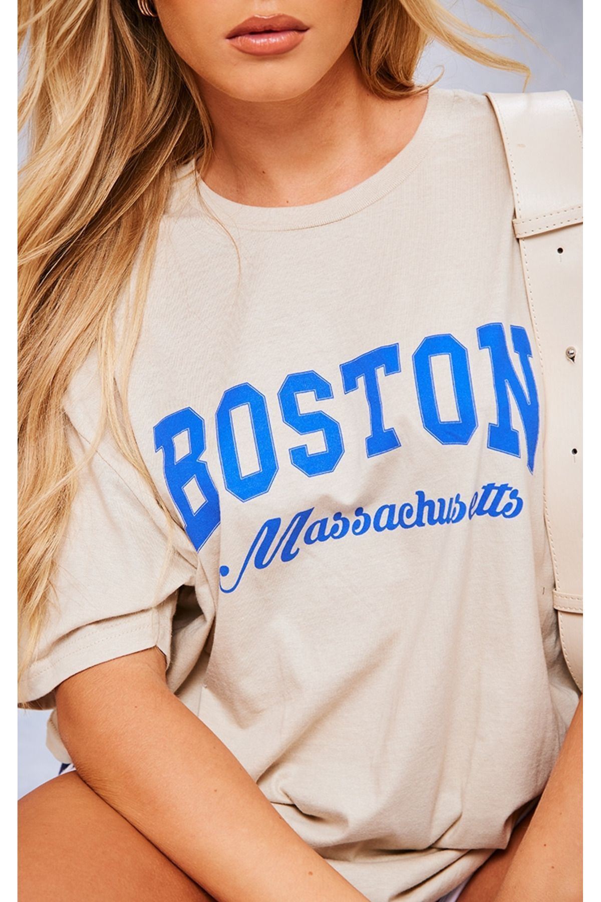 Boston Massachusetts Süprem T-Shirt - Bej Baskılı Oversize Bisiklet Yaka Kısa Kol Tişört