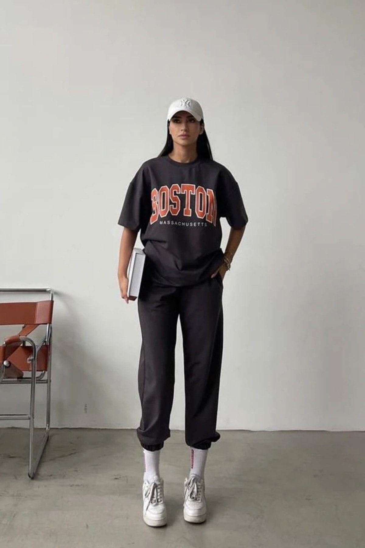 Boston T-shirt Eşofman Altı Jogger - Füme Baskılı Alt Üst Eşofman Takımı Oversize Bisiklet Yaka