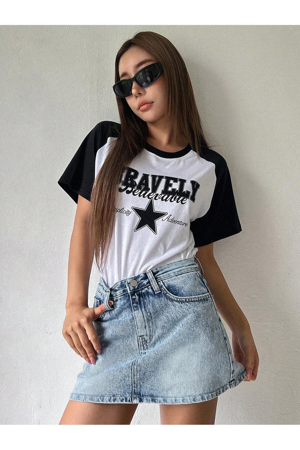 Bravelly Yıldız Parçalı Süprem T-Shirt - Beyaz Siyah Oversize Bisiklet Yaka Kısa Kol Tişört