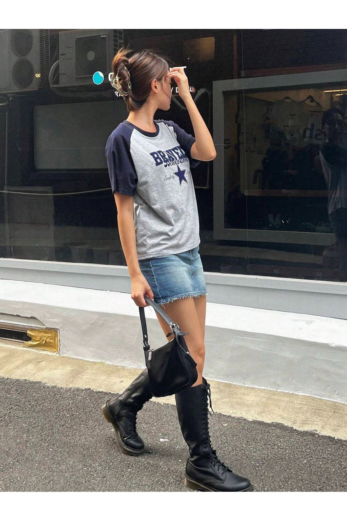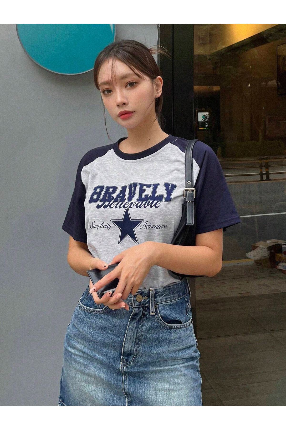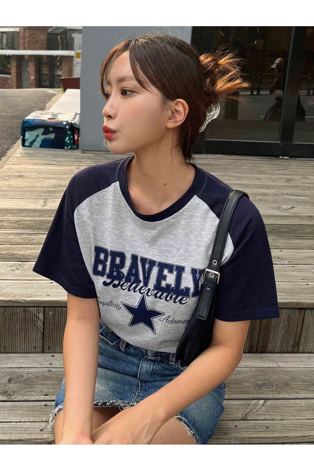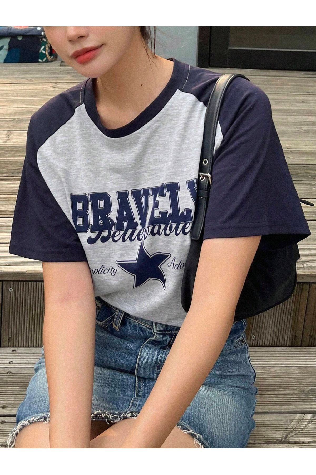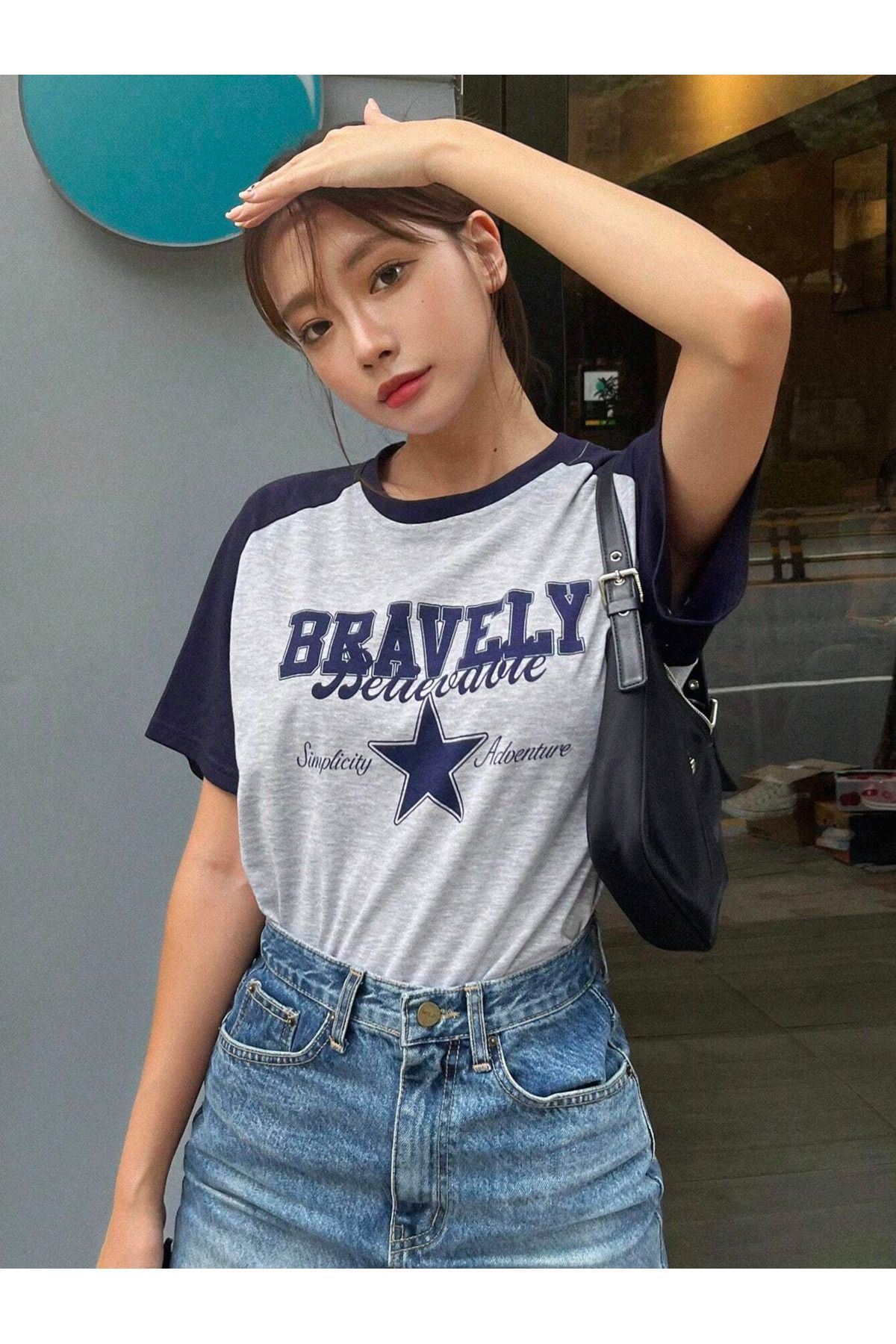 Bravely Parçalı Süprem T-Shirt - Lacivert Gri Baskılı Oversize Bisiklet Yaka Kısa Kol Tişört