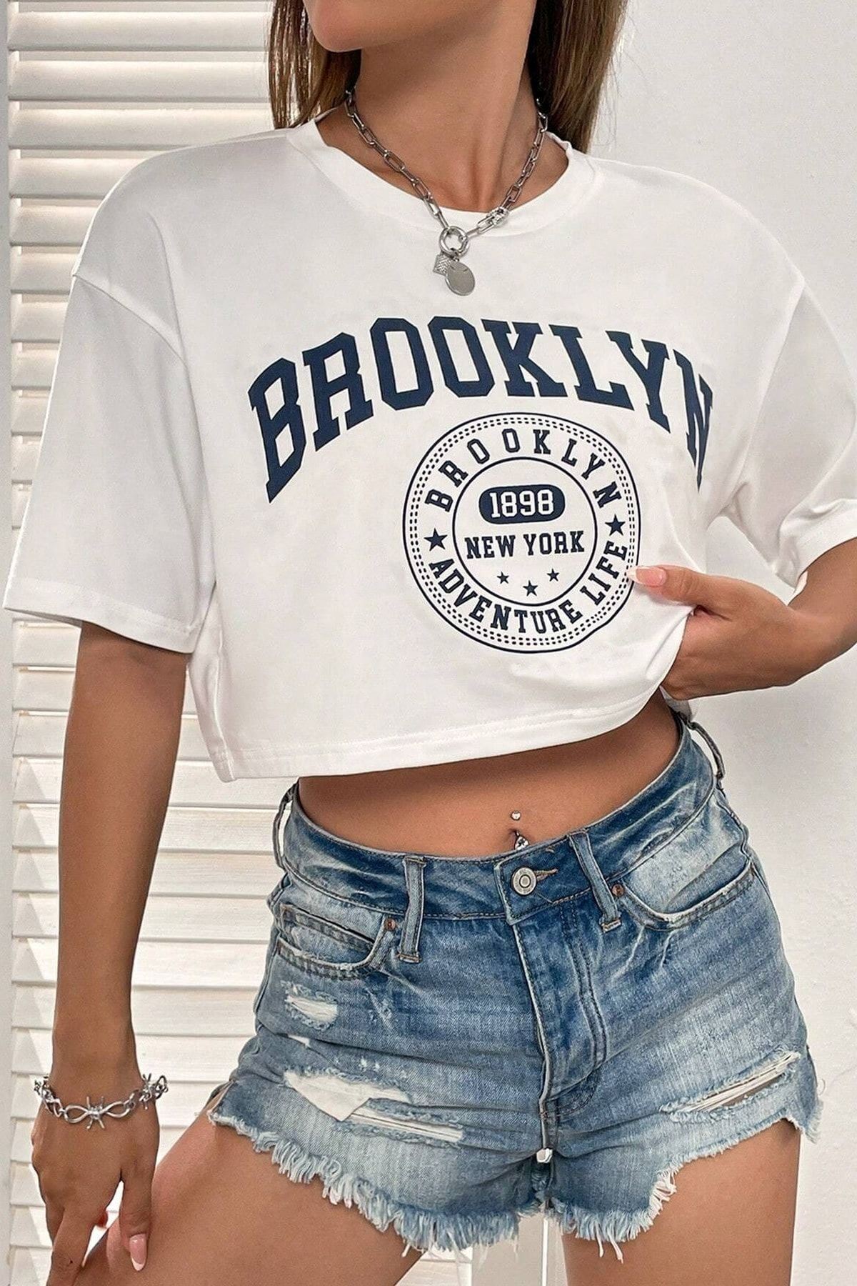Brooklyn 1898 Adventure Baskılı Kadın Crop Beyaz T-shirt