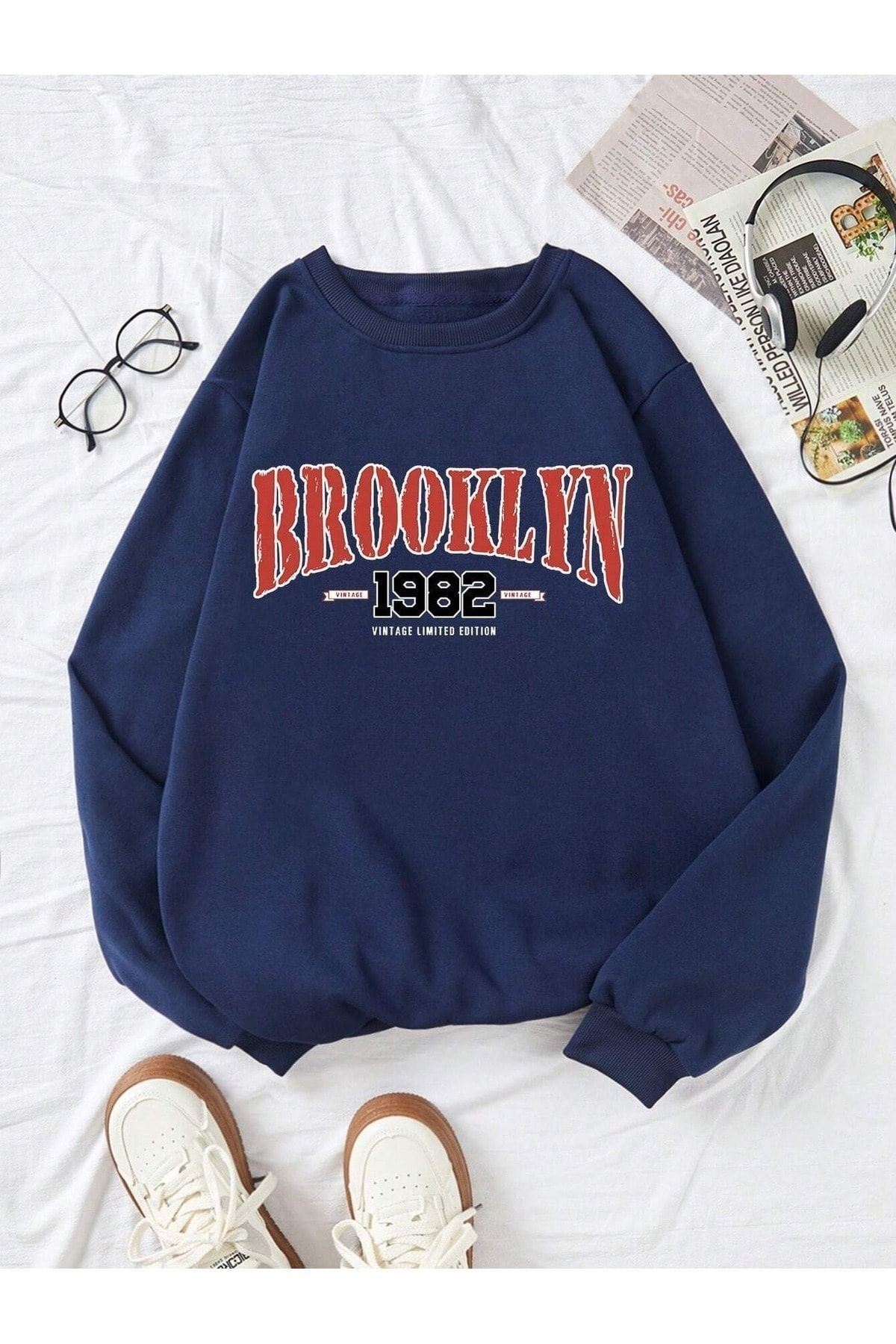 Brooklyn 1982 Sweatshirt - Lacivert Baskılı Oversize Bisiklet Yaka