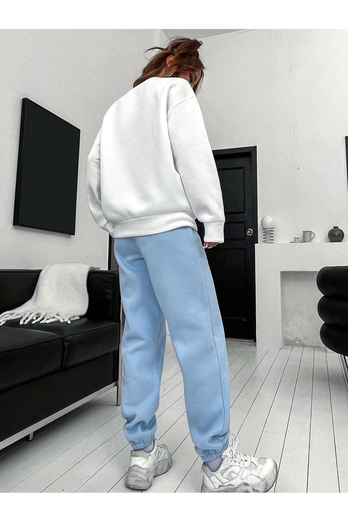 Brooklyn Eşofman Takımı Beyaz Sweatshirt Bebe Mavi Jogger - Baskılı Oversize Şardonlu Bisiklet Yaka