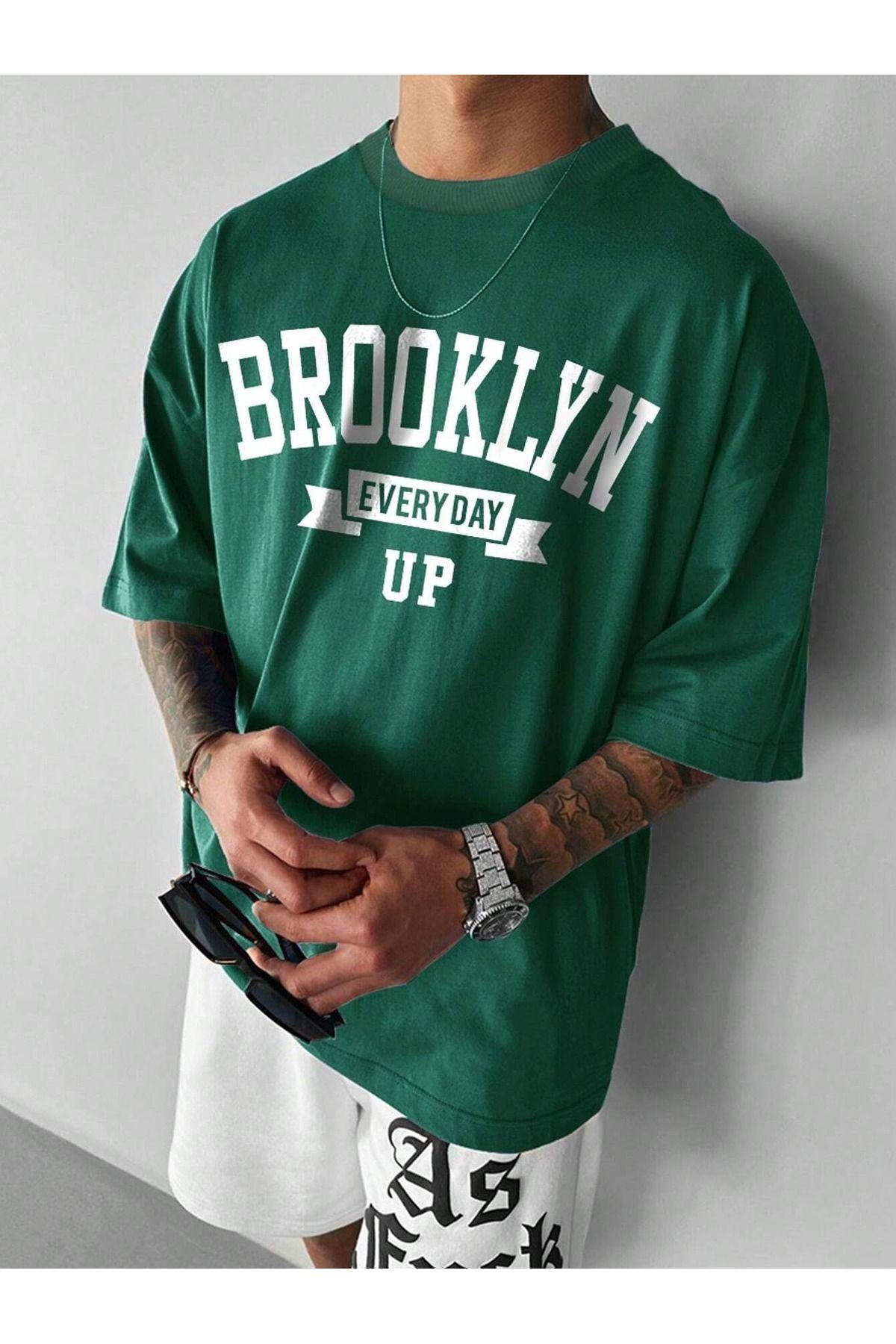Brooklyn Every Day Up Süprem T-Shirt - Nefti Yeşil Baskılı Oversize Bisiklet Yaka Kısa Kol Tişört