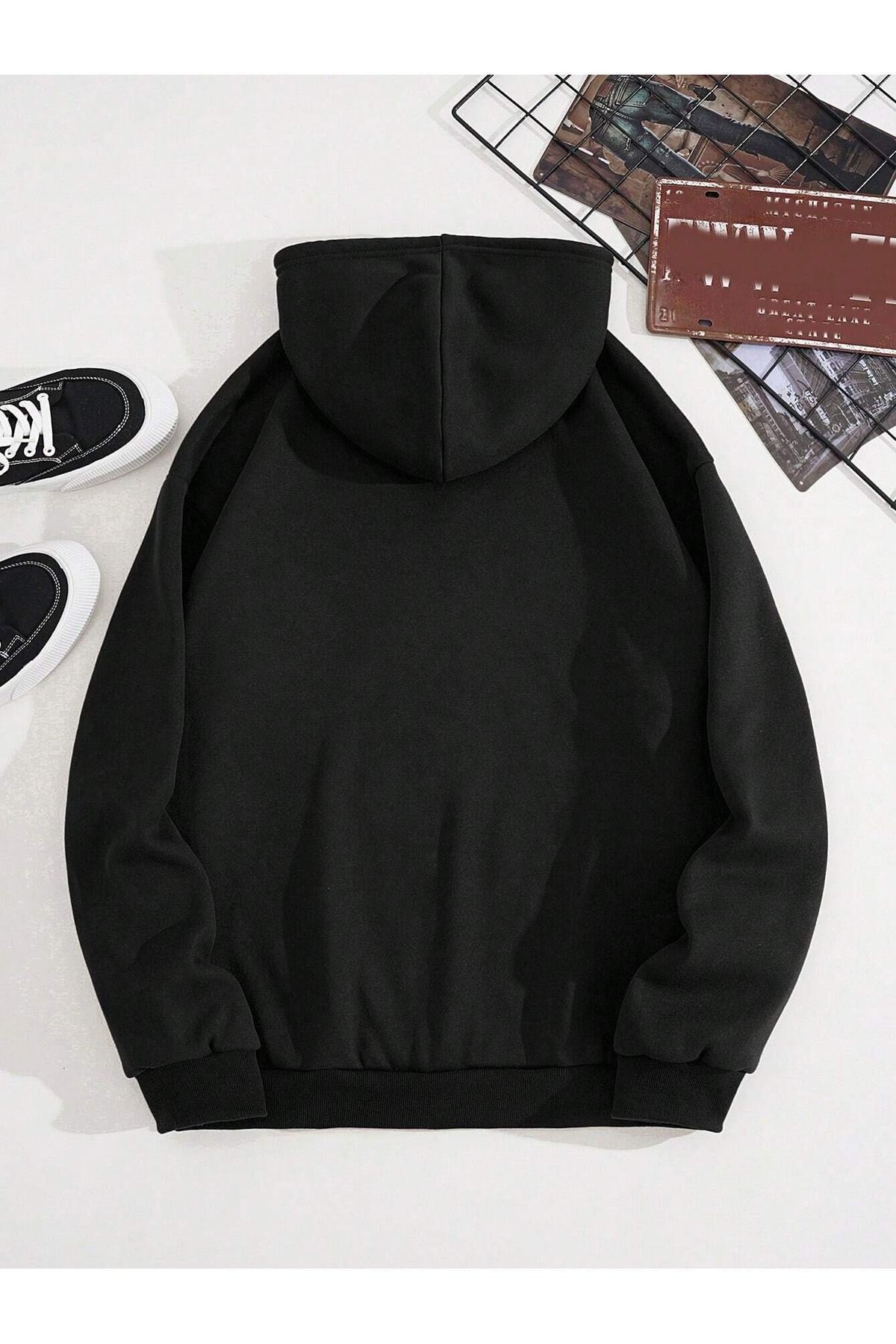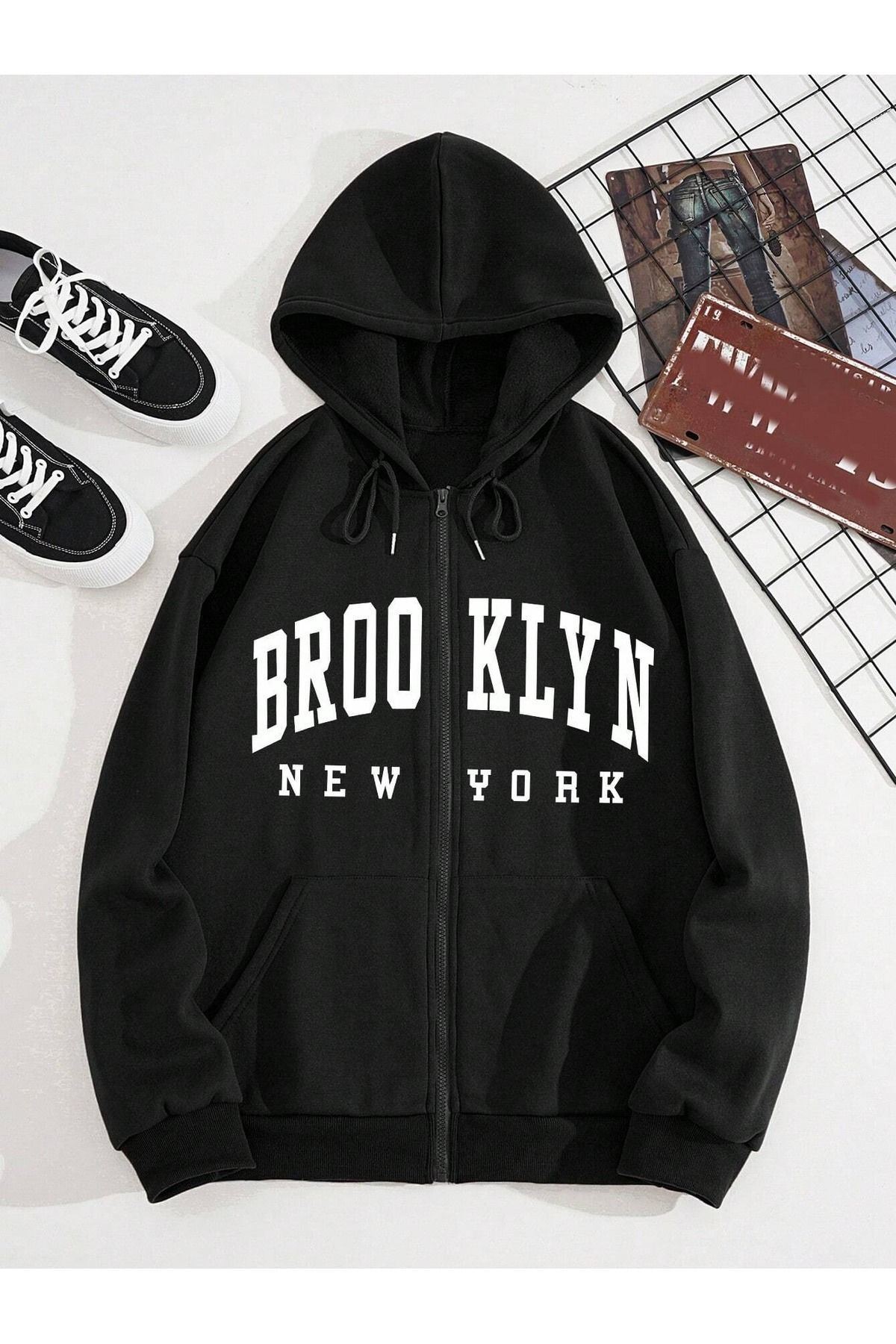 Brooklyn New York Hırka - Siyah Baskılı Oversize Kapüşonlu