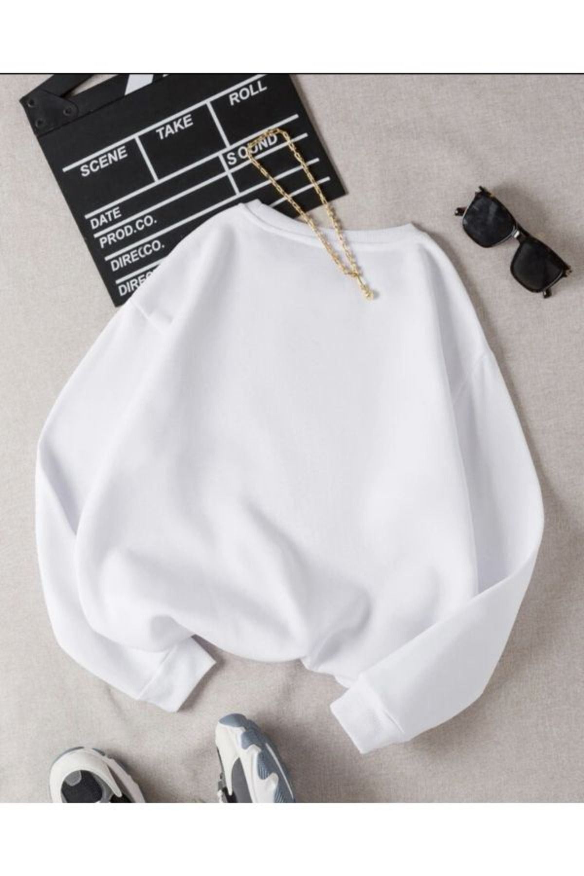 Brooklyn New York Sweatshirt - Beyaz Baskılı Oversize Kalın Kışlık Bisiklet Yaka