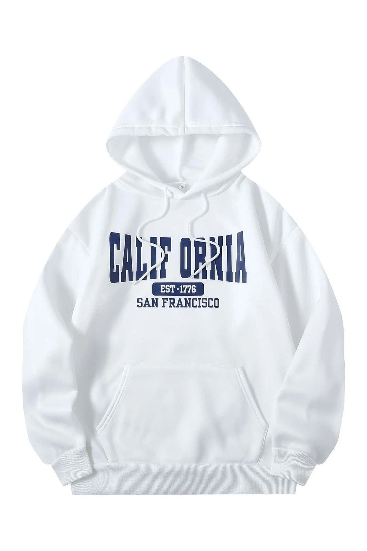 Calif Ornia 1776 Sweatshirt - Beyaaz Baskılı Oversize Kapüşonlu