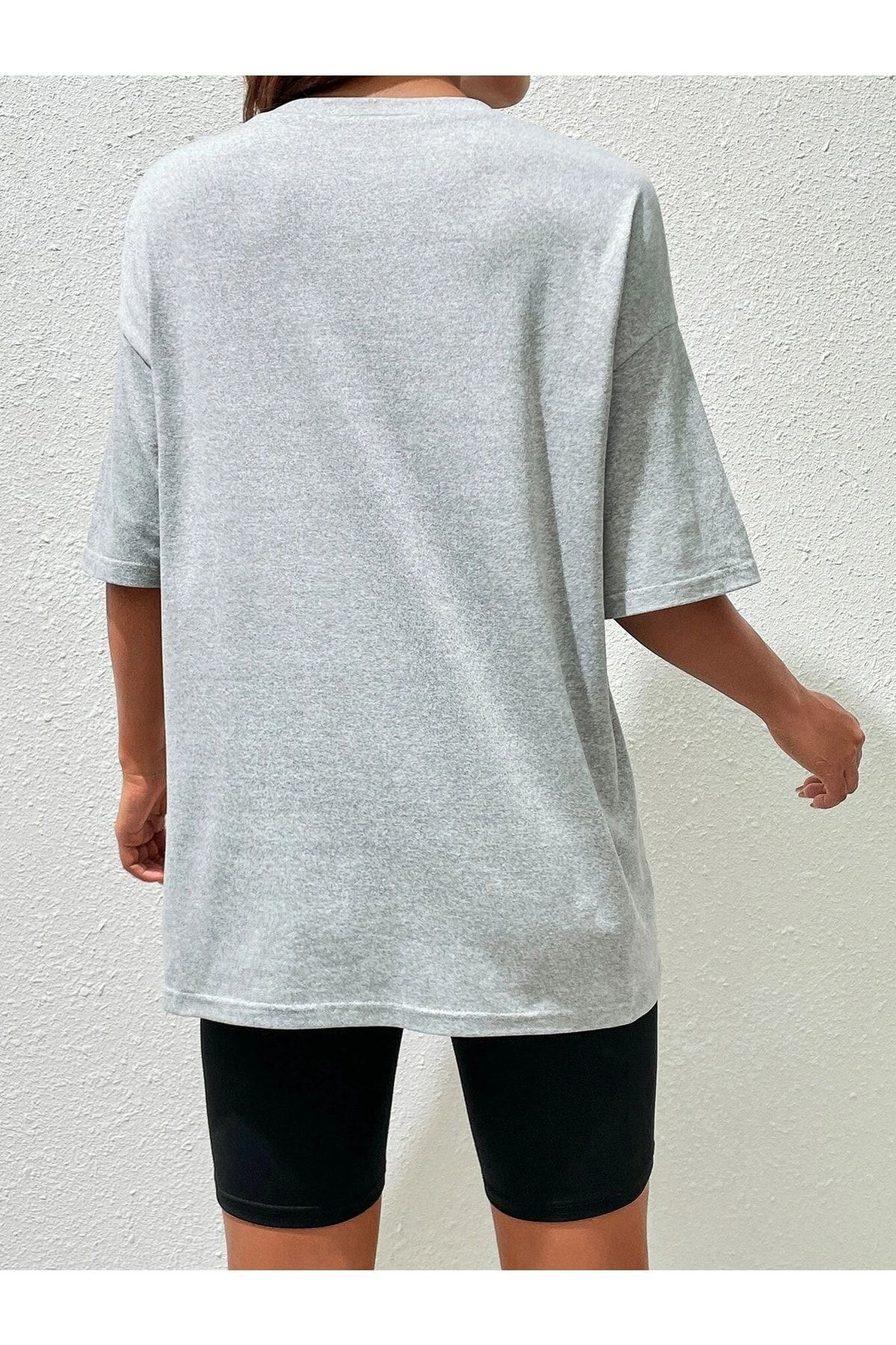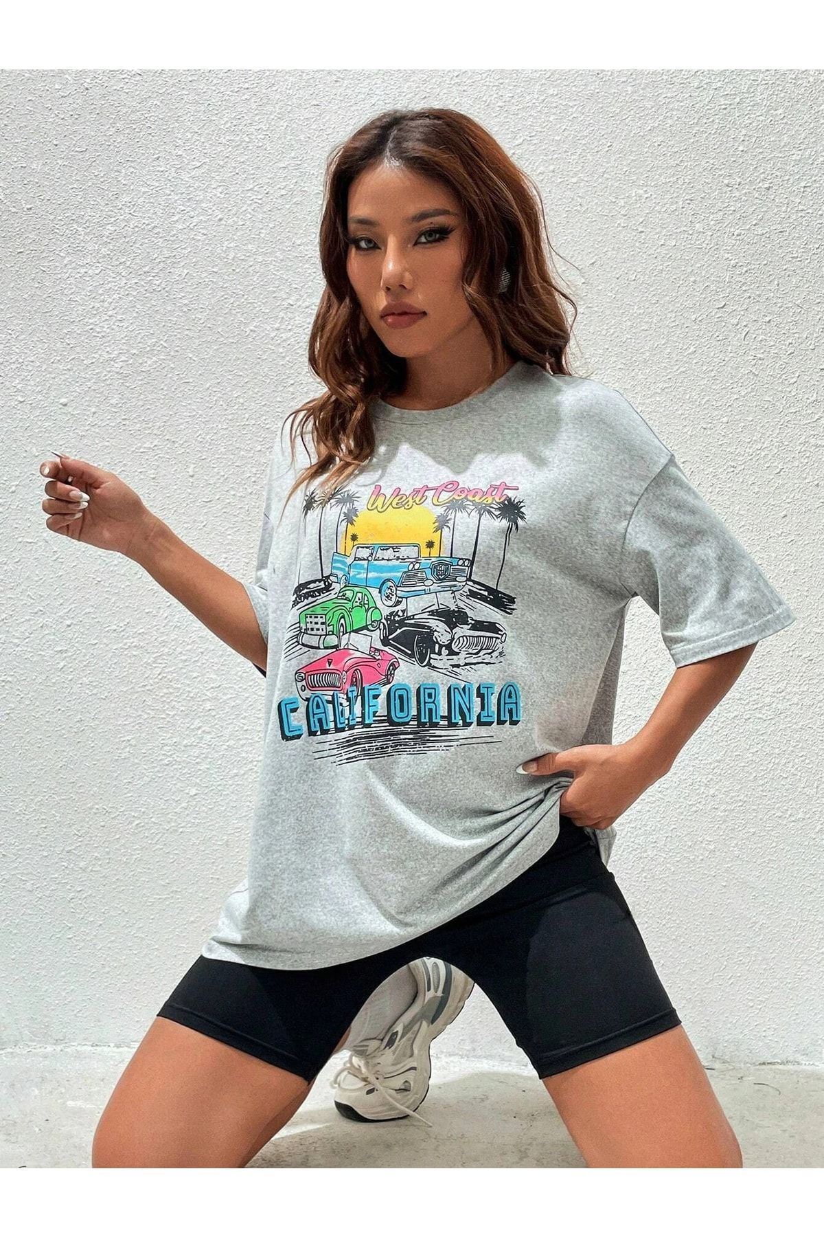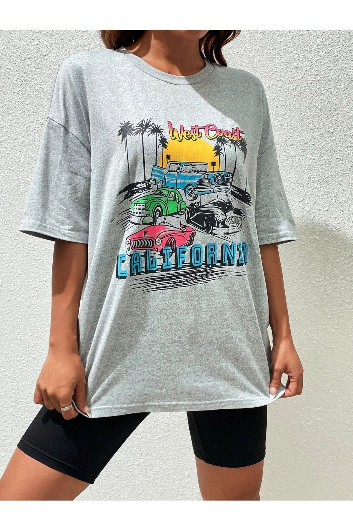 California Arabalar T-shirt - Gri Baskılı Oversize Bisiklet Yaka Kısa Kol Tişört