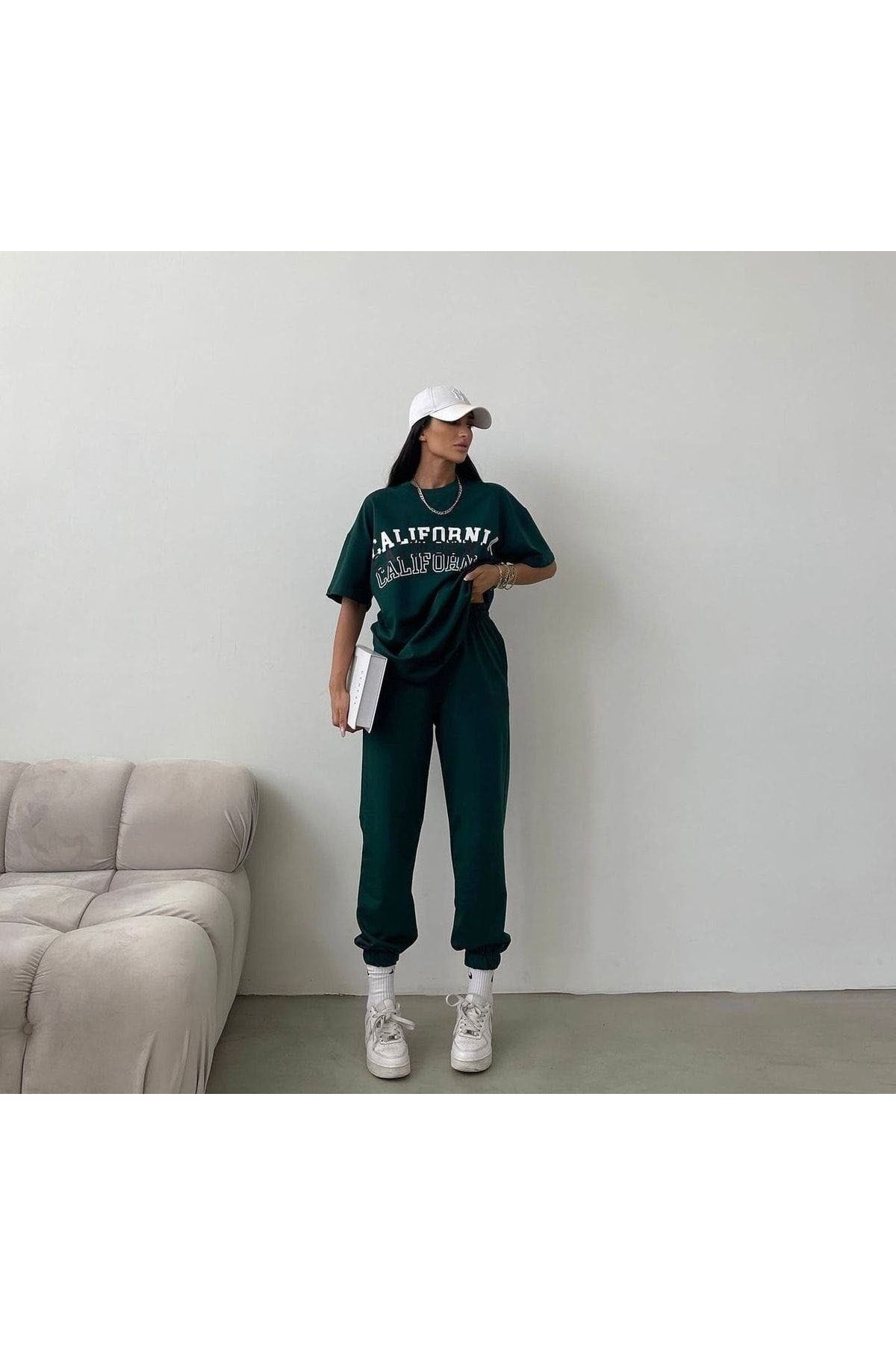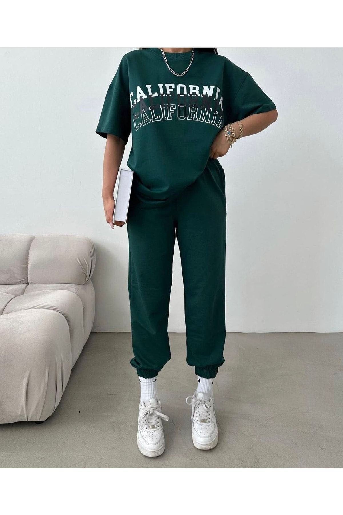 California Desing T-Shirt Eşofman Altı Jogger - Yeşil Baskılı Alt Üst Eşofman Takımı Bisiklet Yaka