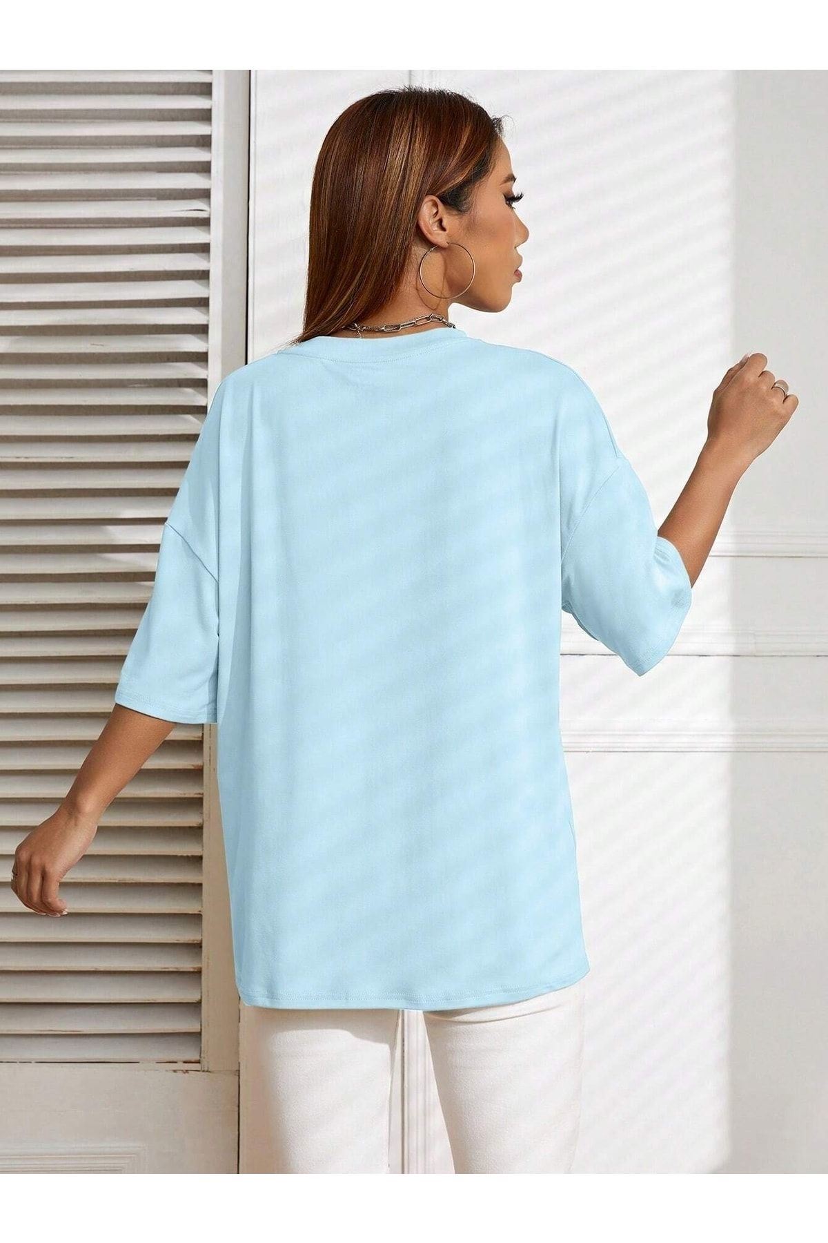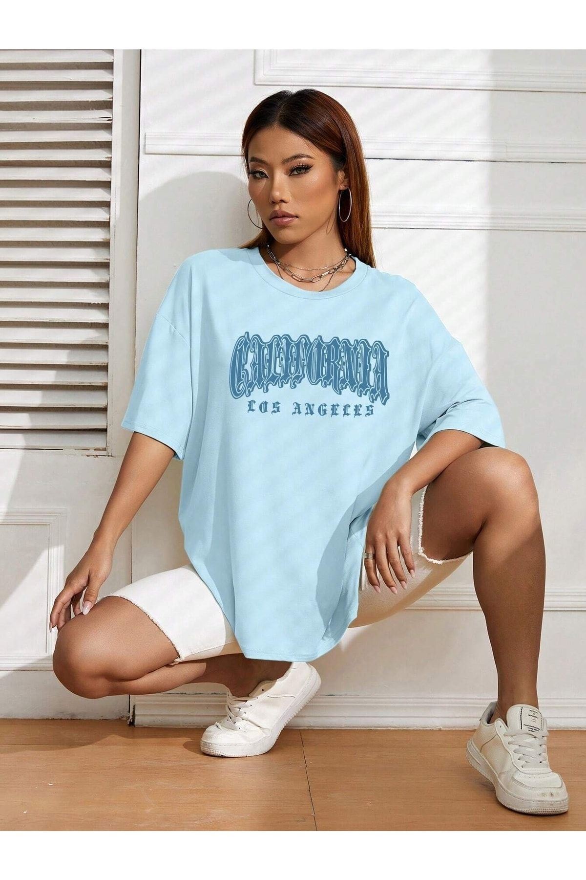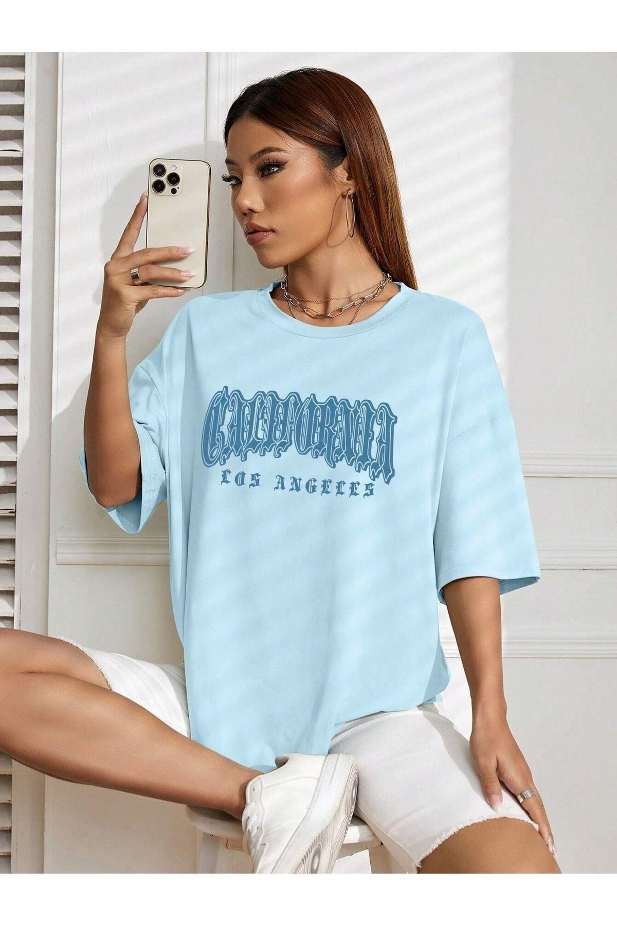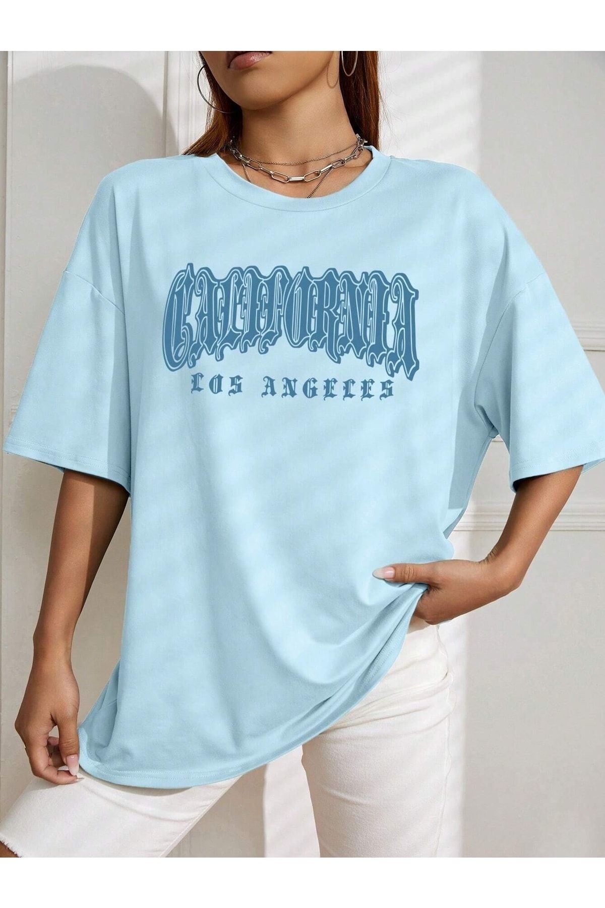 California Letter T-shirt - Bebe Mavisi Baskılı Oversize Bisiklet Yaka Kısa Kol Tişört