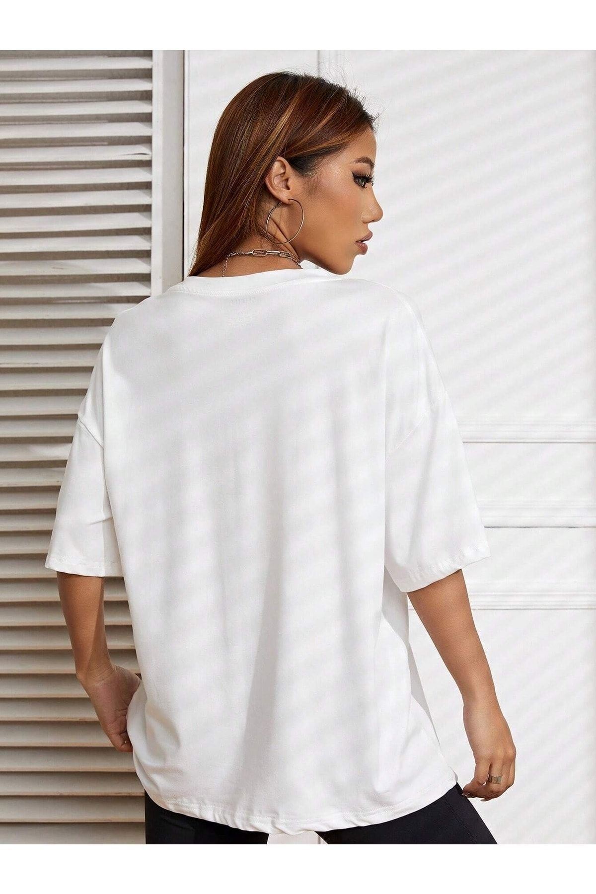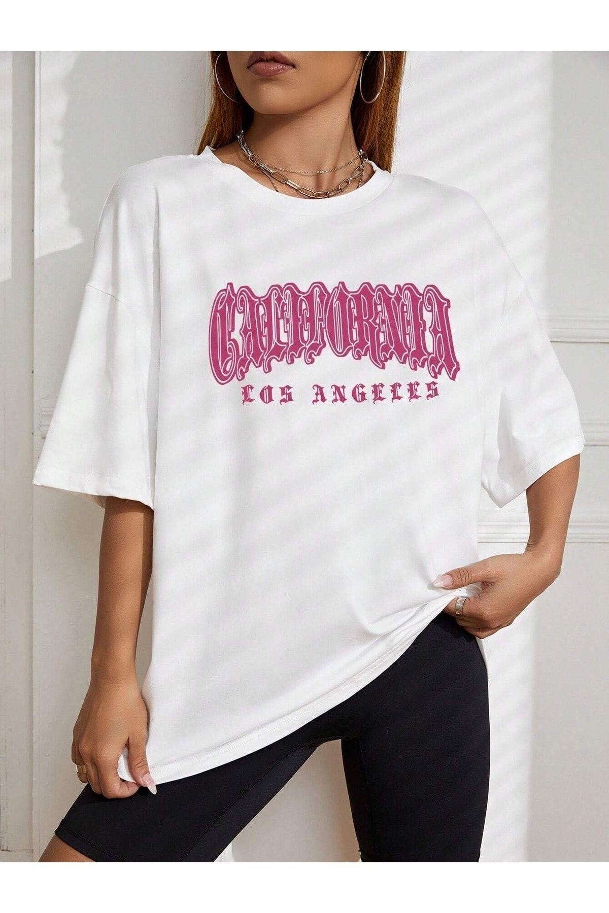 California Letter T-Shirt - Beyaz Baskılı Oversize Bisiklet Yaka Kısa Kol Tişört