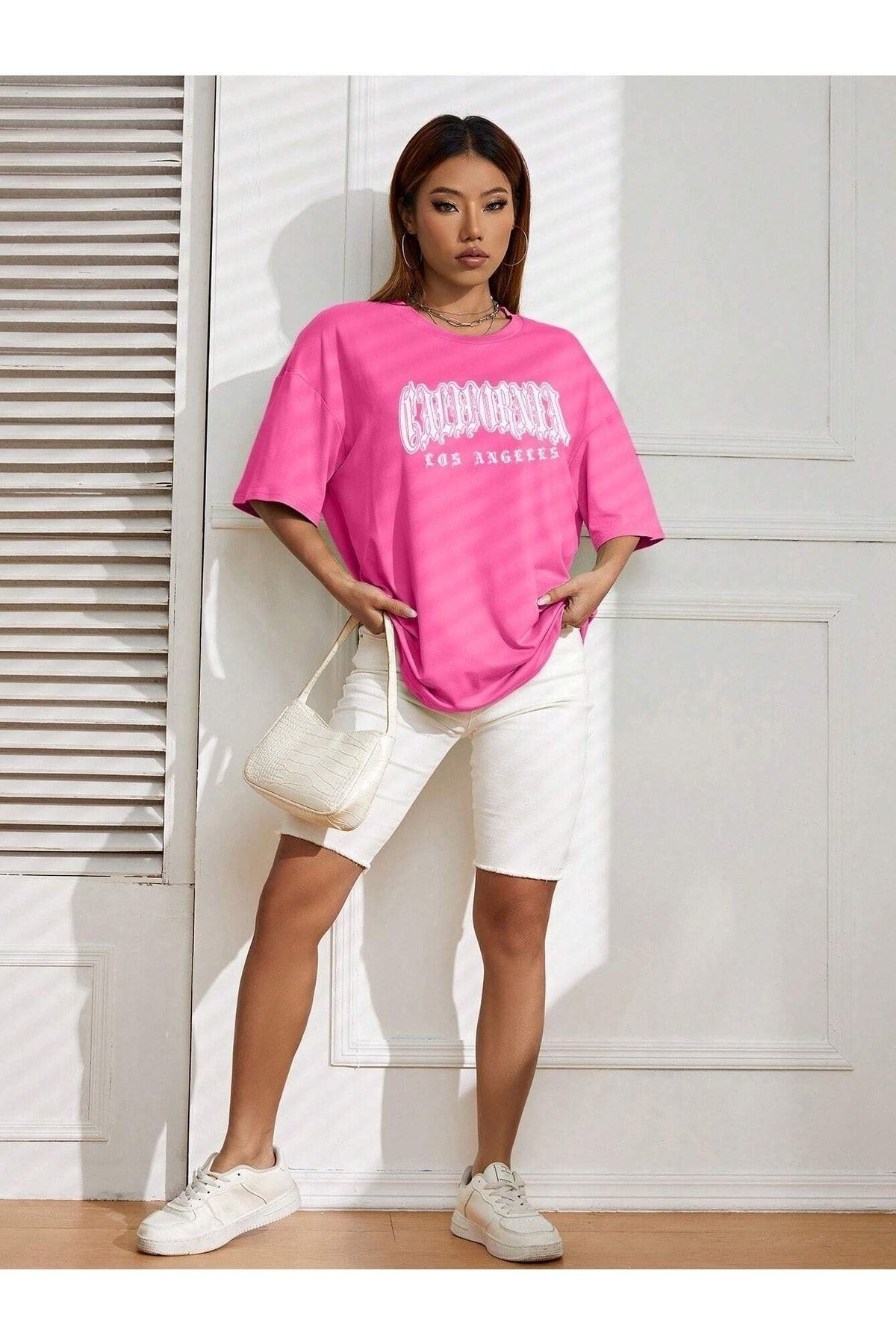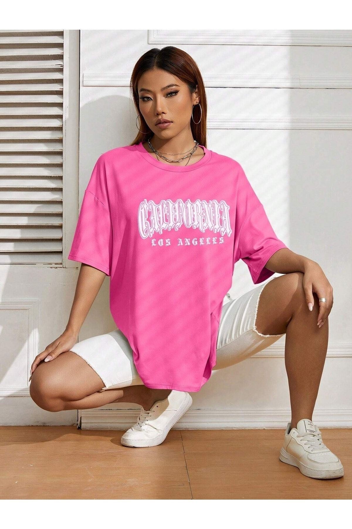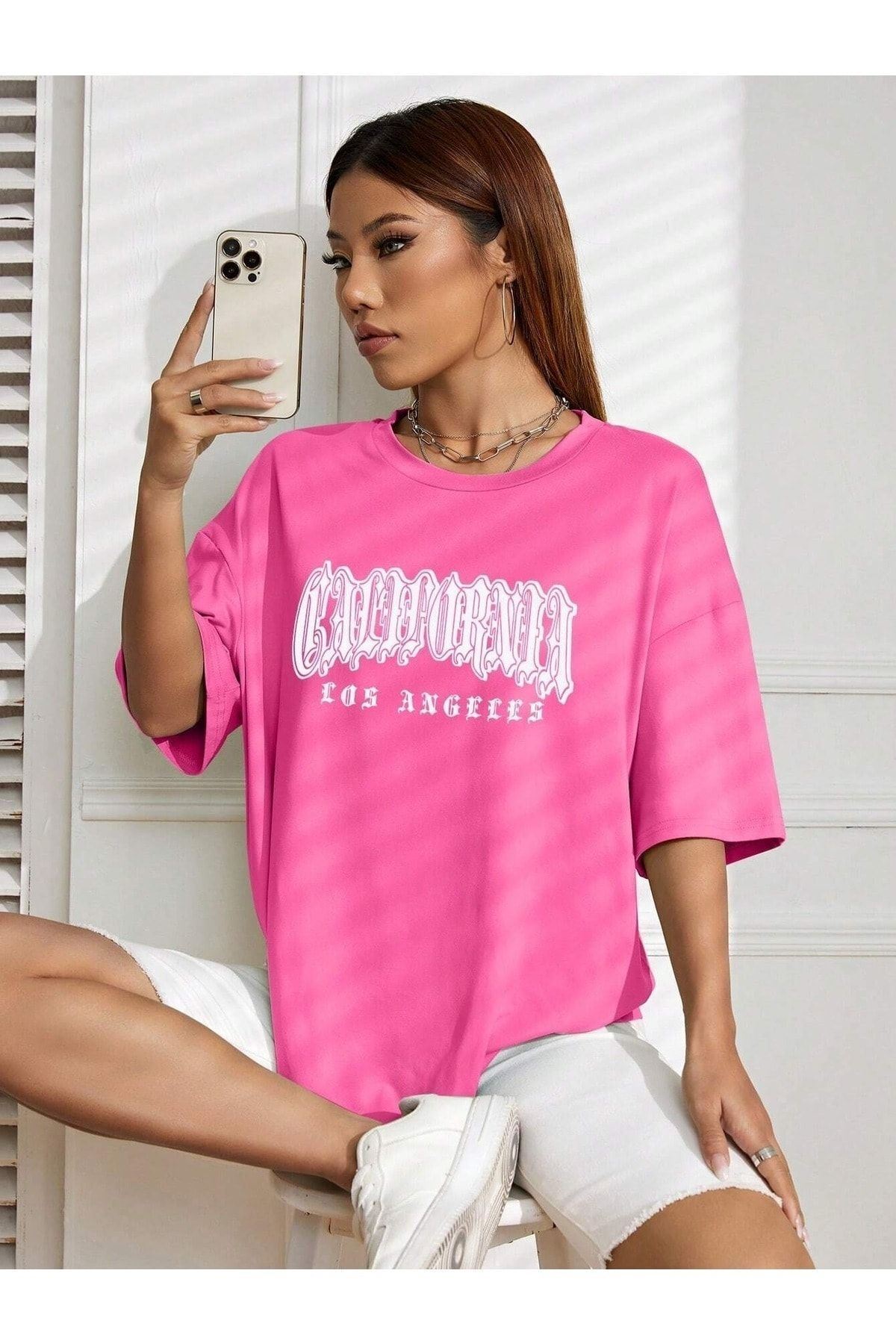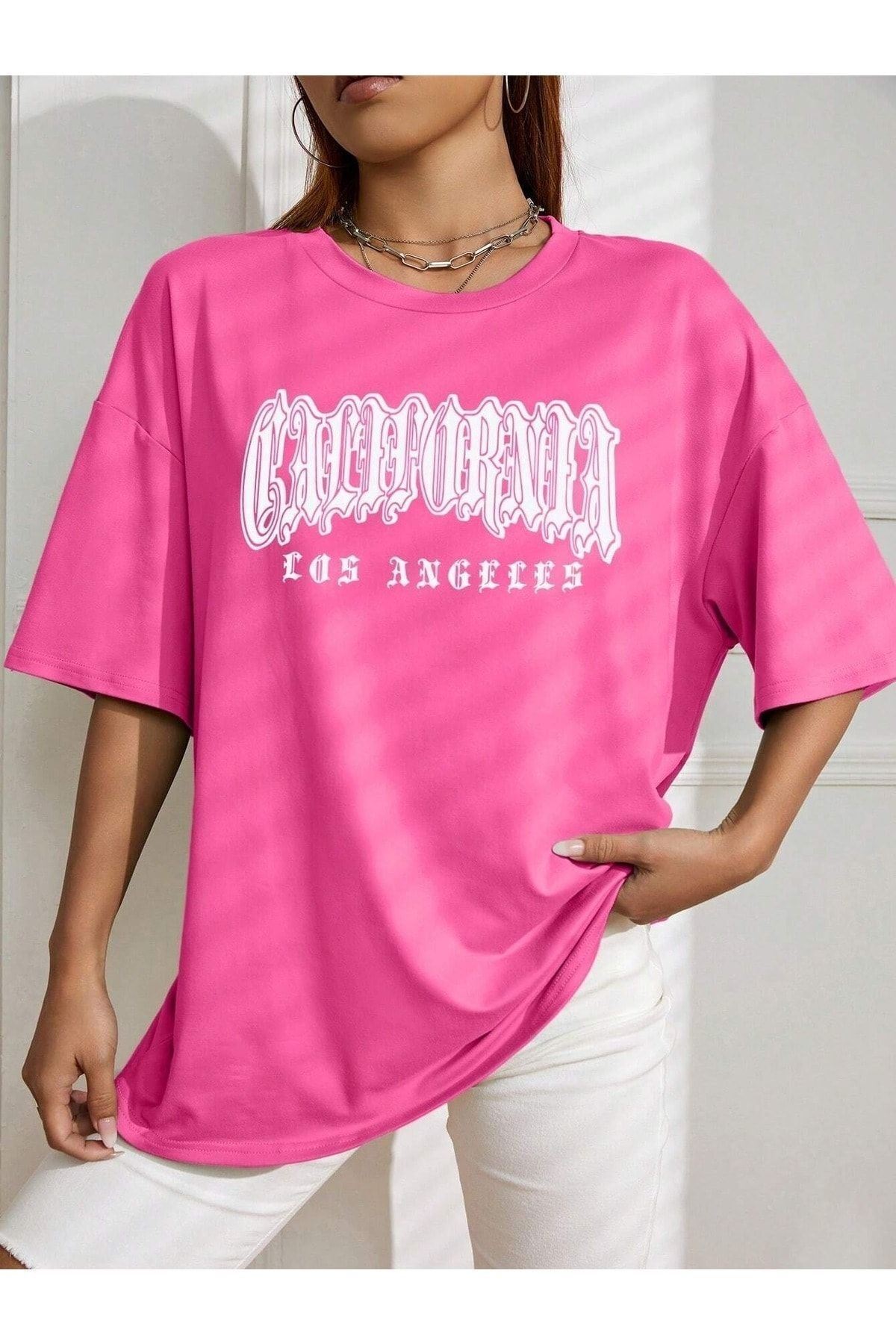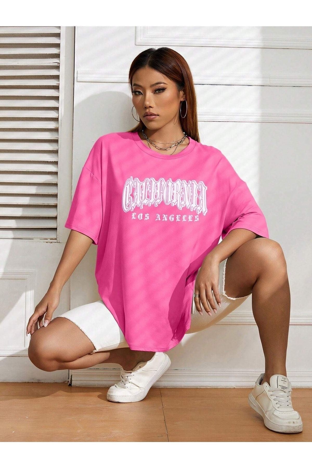 California Letter T-Shirt - Pembe Baskılı Oversize Bisiklet Yaka Kısa Kol Tişört