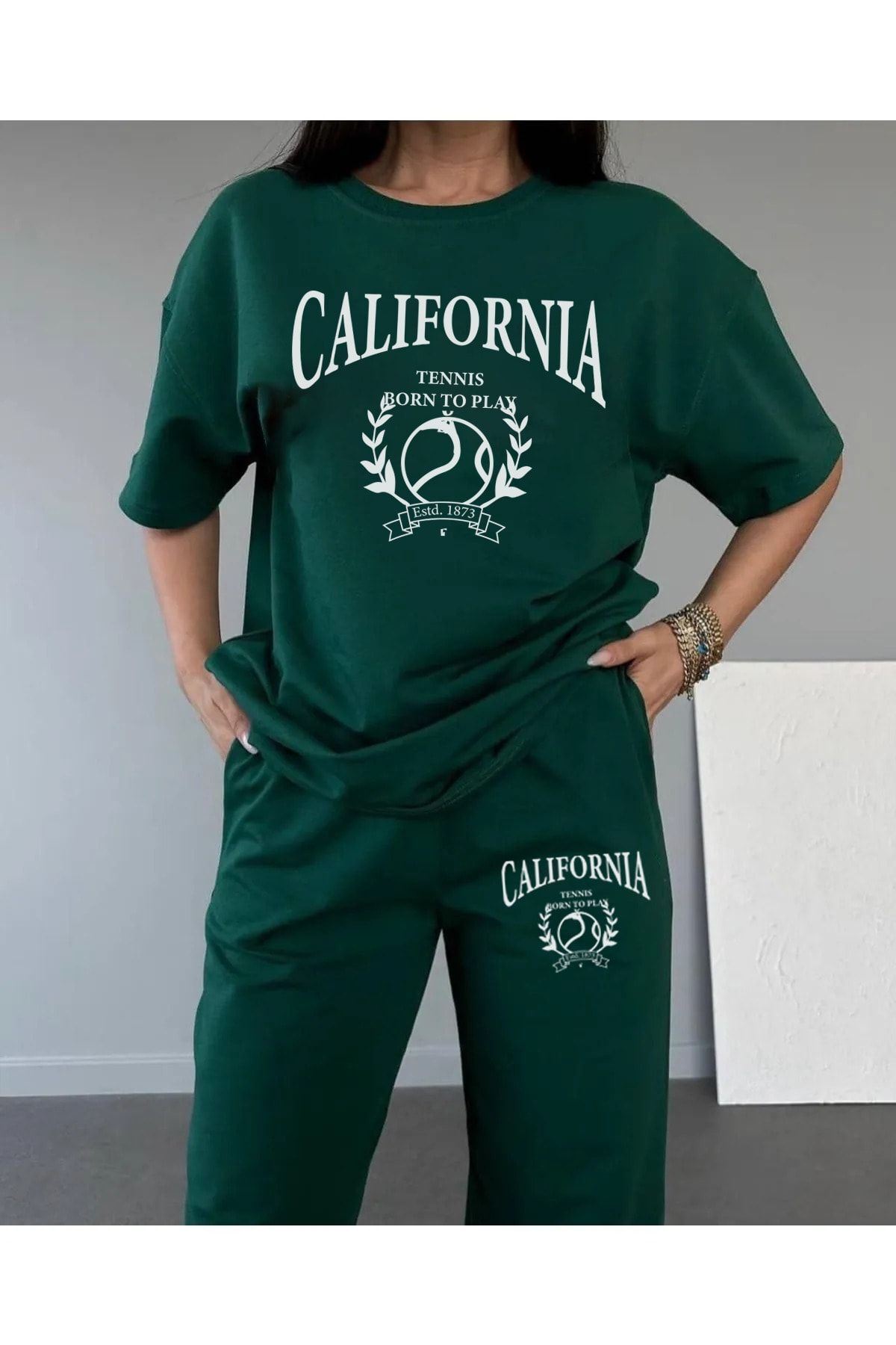 California Tenis T-shirt Eşofman Altı Jogger- Yeşil Baskılı Alt Üst Eşofman Takım Oversize Bisiklet