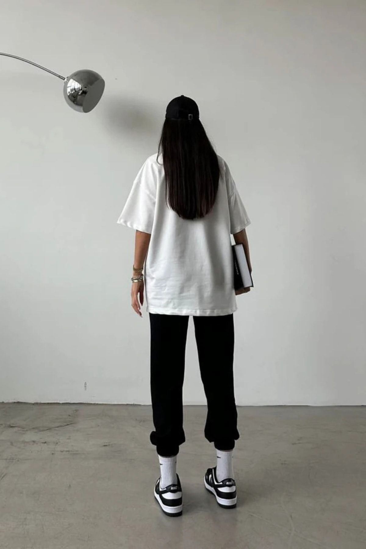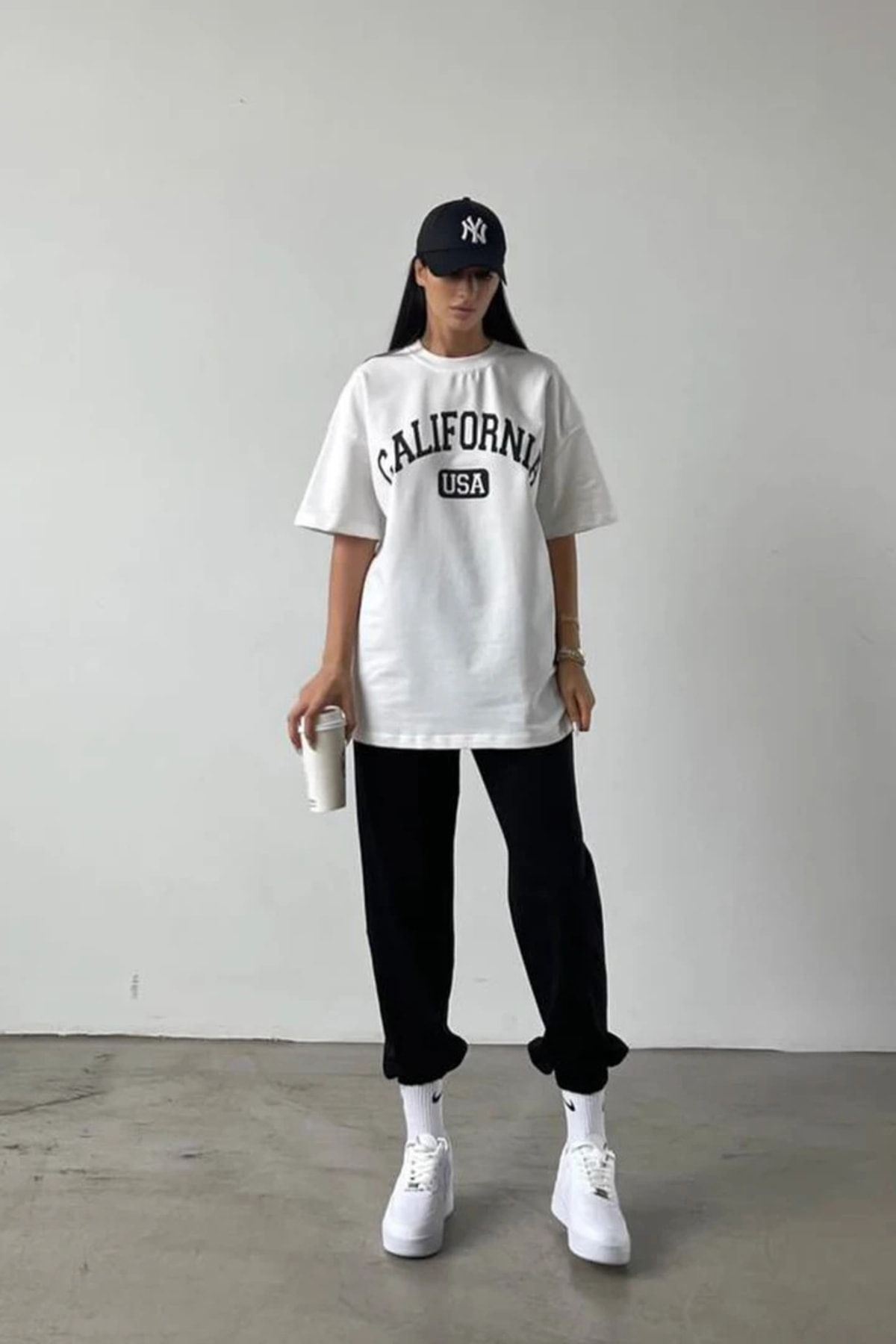 California Usa Beyaz T-shirt Siyah Eşofman Altı Jogger -baskılı Alt Üst Takım Oversize Bisiklet Yak