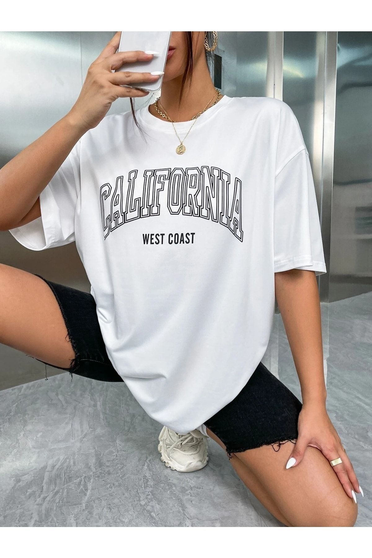 California W.c T-shirt - Beyaz Baskılı Oversize Bisiklet Yaka Kısa Kol Tişört