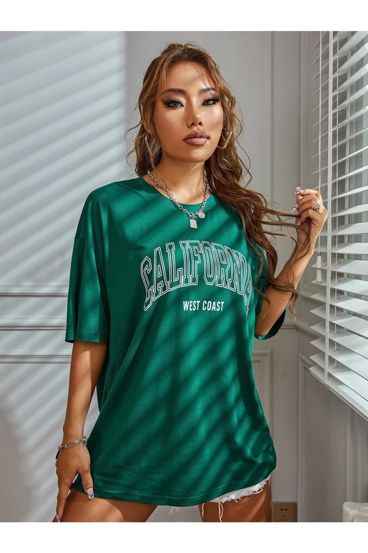 California W.c T-shirt - Yeşil Baskılı Oversize Bisiklet Yaka Kısa Kol Tişört