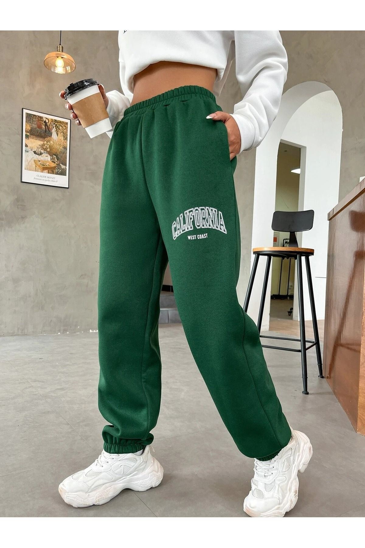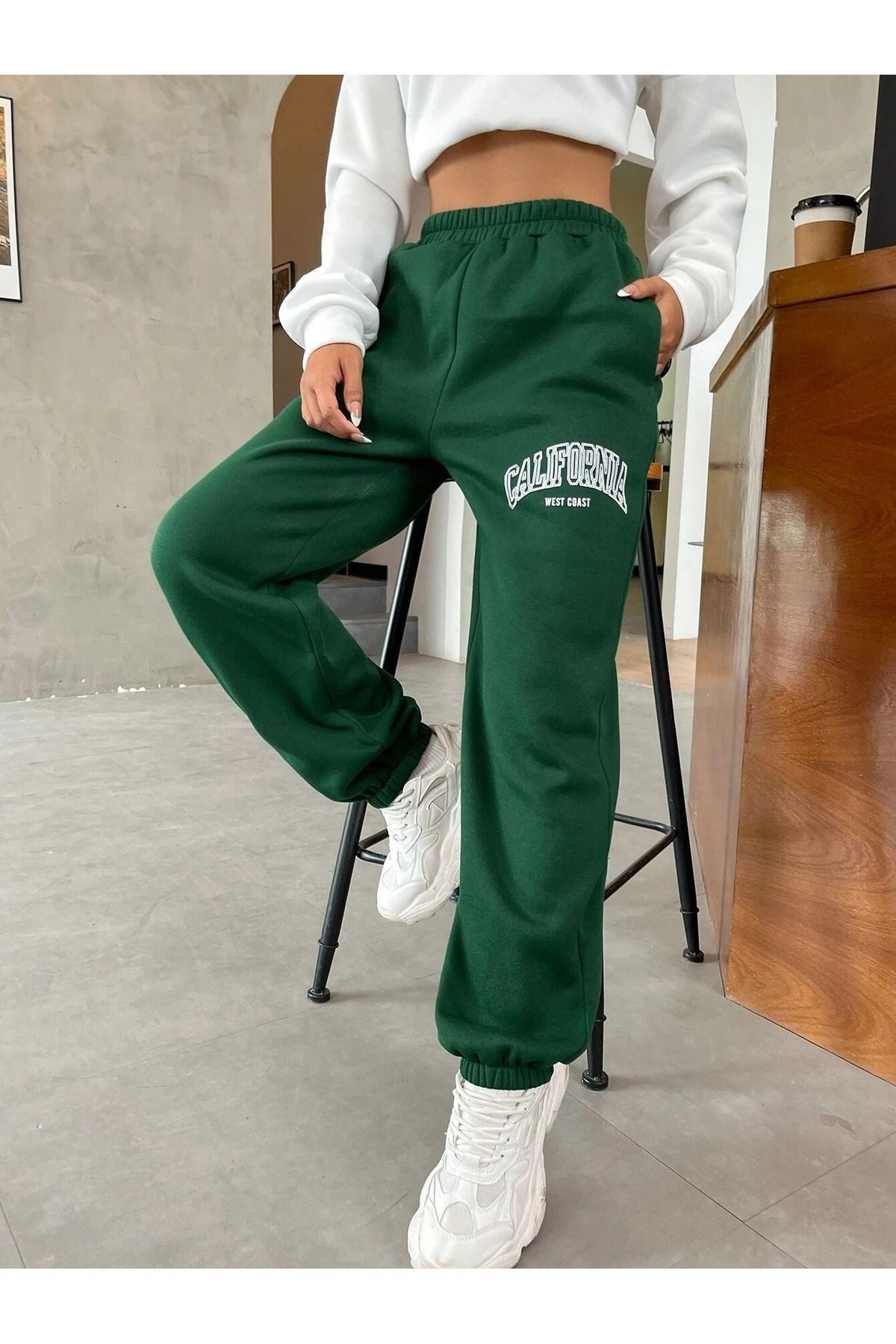 California West Coast Eşofman Altı Jogger - Yeşil Baskılı Lastik Paça Yüksel Bel