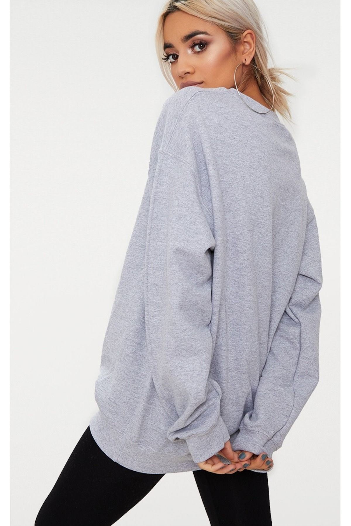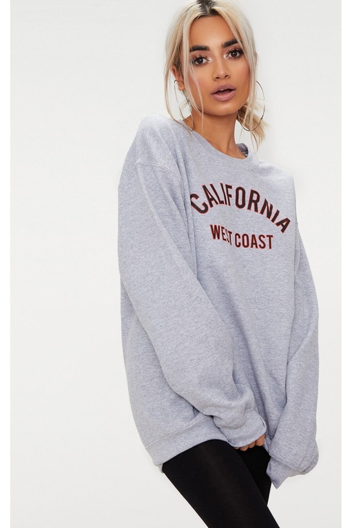 California West Coast Letter Sweatshirt - Gri Baskılı Oversize Bisiklet Yaka