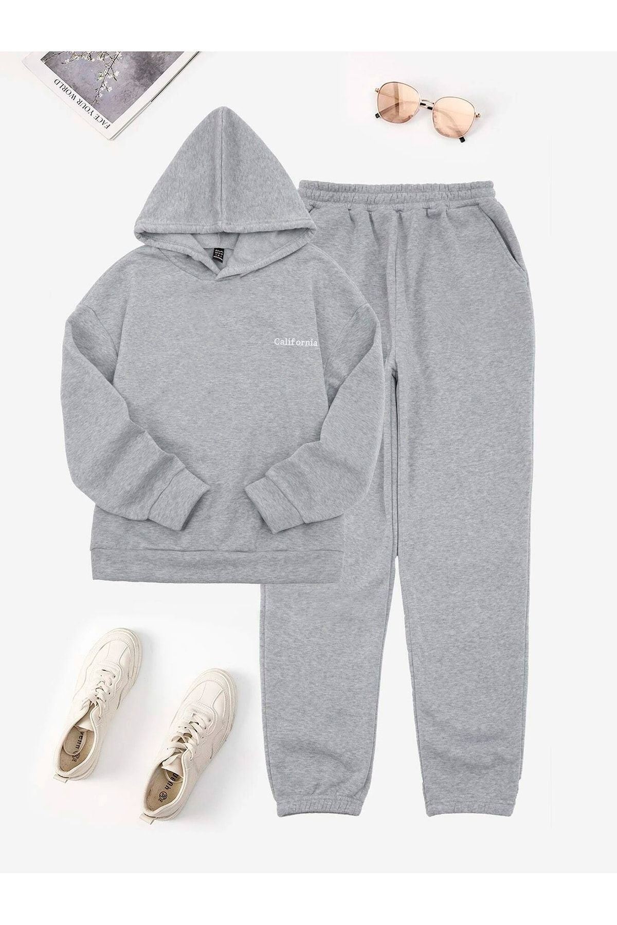 California Yazılı Eşofman Takımı Sweatshirt Jogger - Gri Baskılı Oversize Şardonlu Kapüşonlu