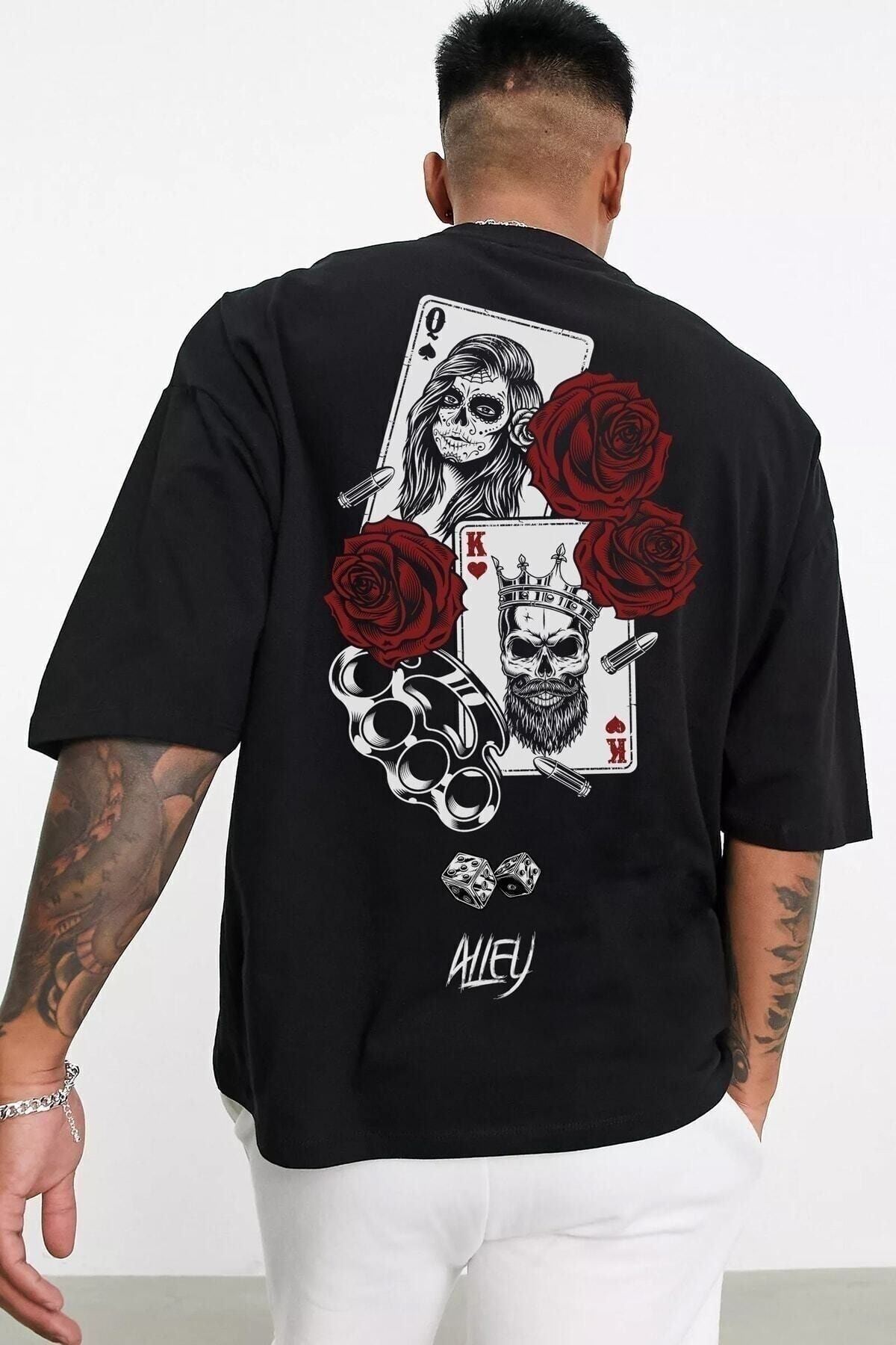 Card T-shirt - Siyah Baskılı Oversize Bisiklet Yaka Kısa Kol Tişört