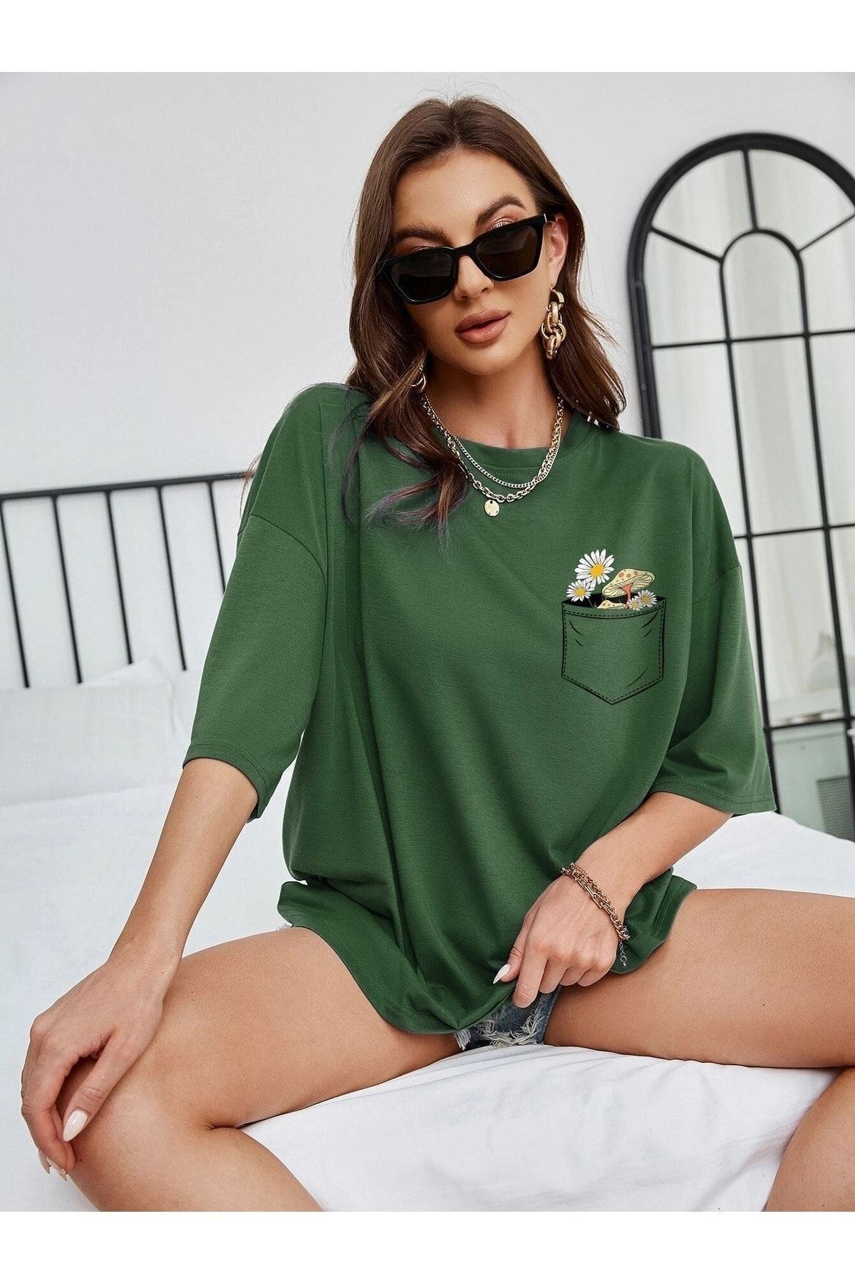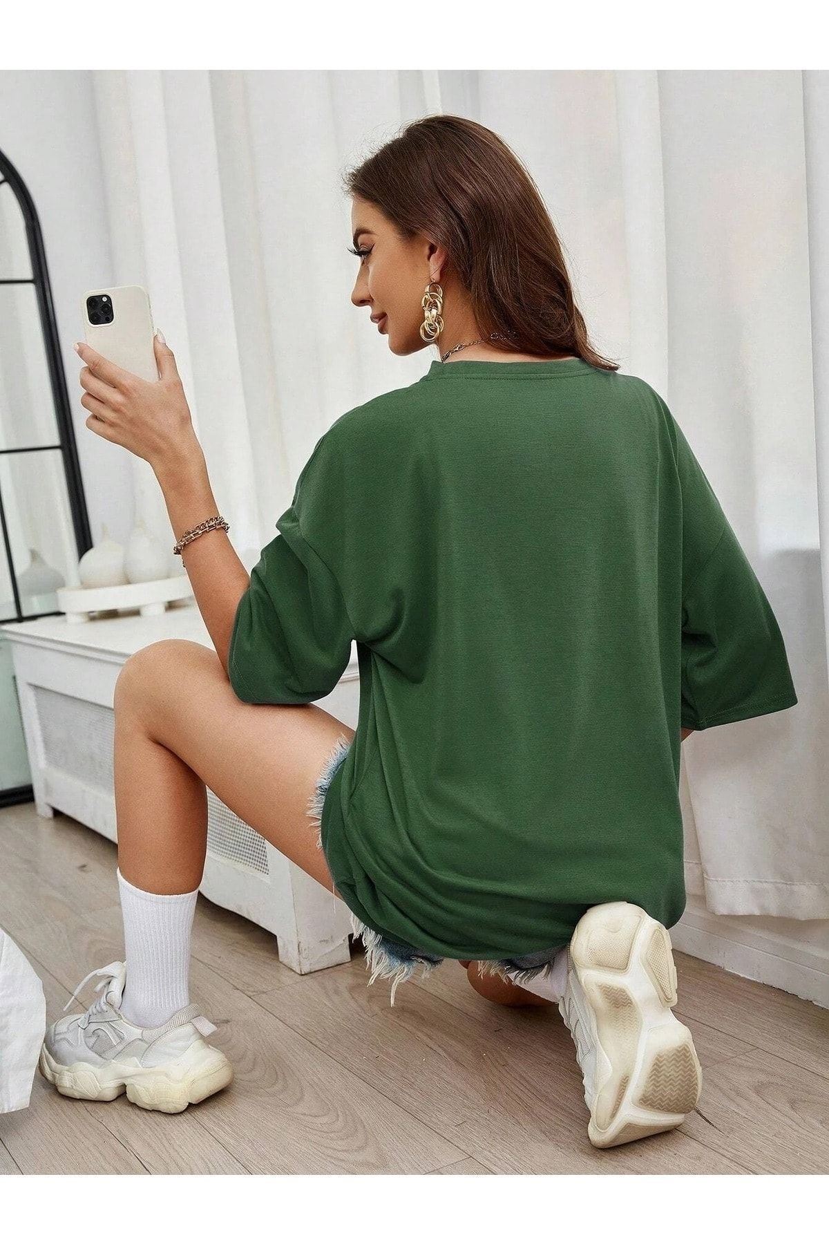 Cep Detay Baskılı T-Shirt - Yeşil Oversize Bisiklet Yaka Kısa Kol