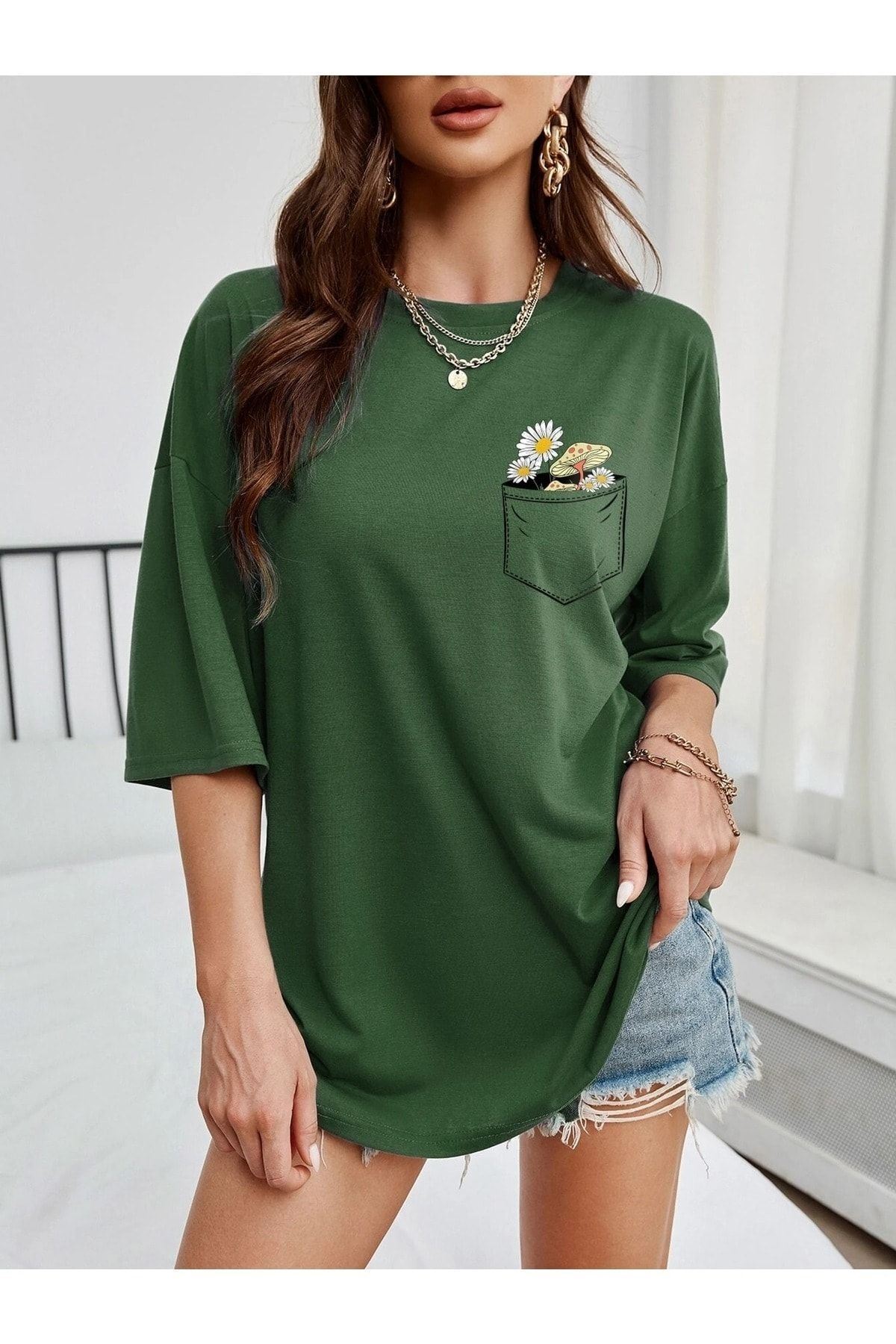 Cep Detay Baskılı T-Shirt - Yeşil Oversize Bisiklet Yaka Kısa Kol