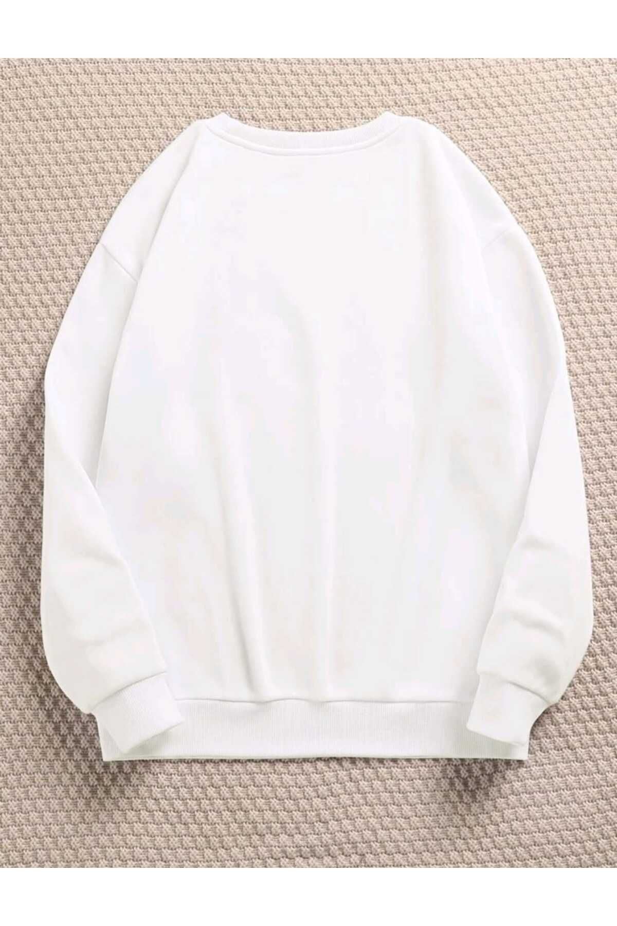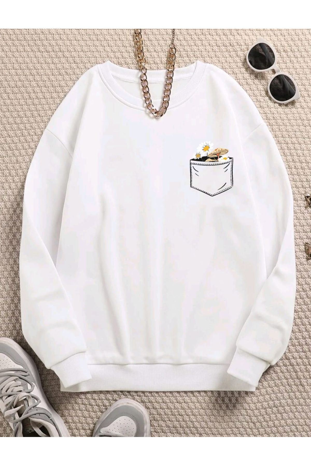 Cep Tasarım Papatya Desen Sweatshirt - Beyaz Baskılı Oversize Kalın Kışlık Bisiklet Yaka