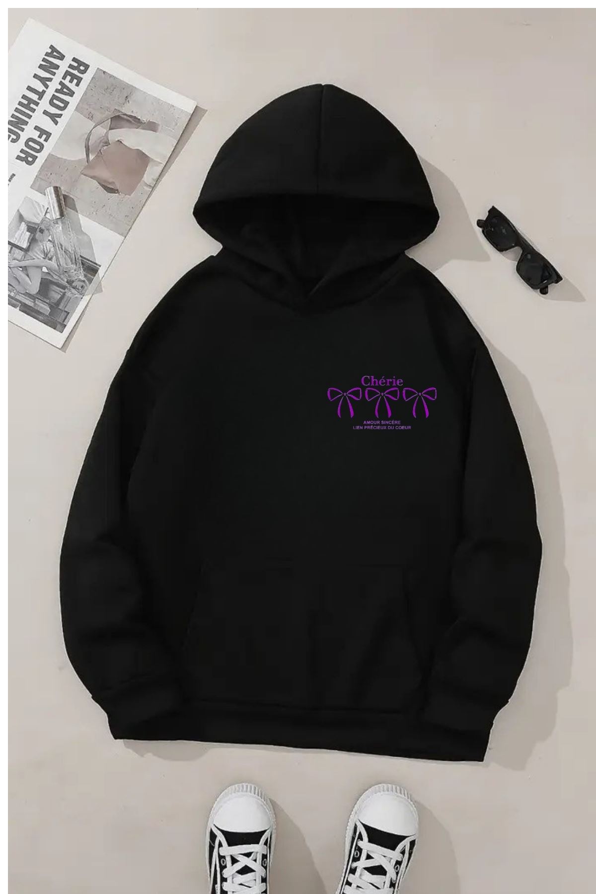Şıklığı ve rahatlığı bir arada sunan Chérie Baskılı Unisex Siyah Kapüşonlu Sweatshirt, günlük stilinize modern bir dokunuş katıyor.; Ön kısmında yer alan mor renkli zarif fiyonk baskısı ve “Chérie” yazısıyla dikkat çeken bu sweatshirt, Fransız esintili tasarımıyla öne çıkıyor.; Yumuşak dokulu pamuk karışımlı kumaşı sayesinde gün boyu konfor sağlar.; Oversize kesimi sayesinde hem kadın hem erkek kullanıcılar için idealdir.; Soğuk havalarda sıcak tutarken stilinizden ödün vermez.