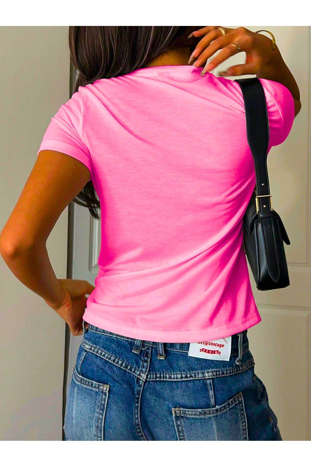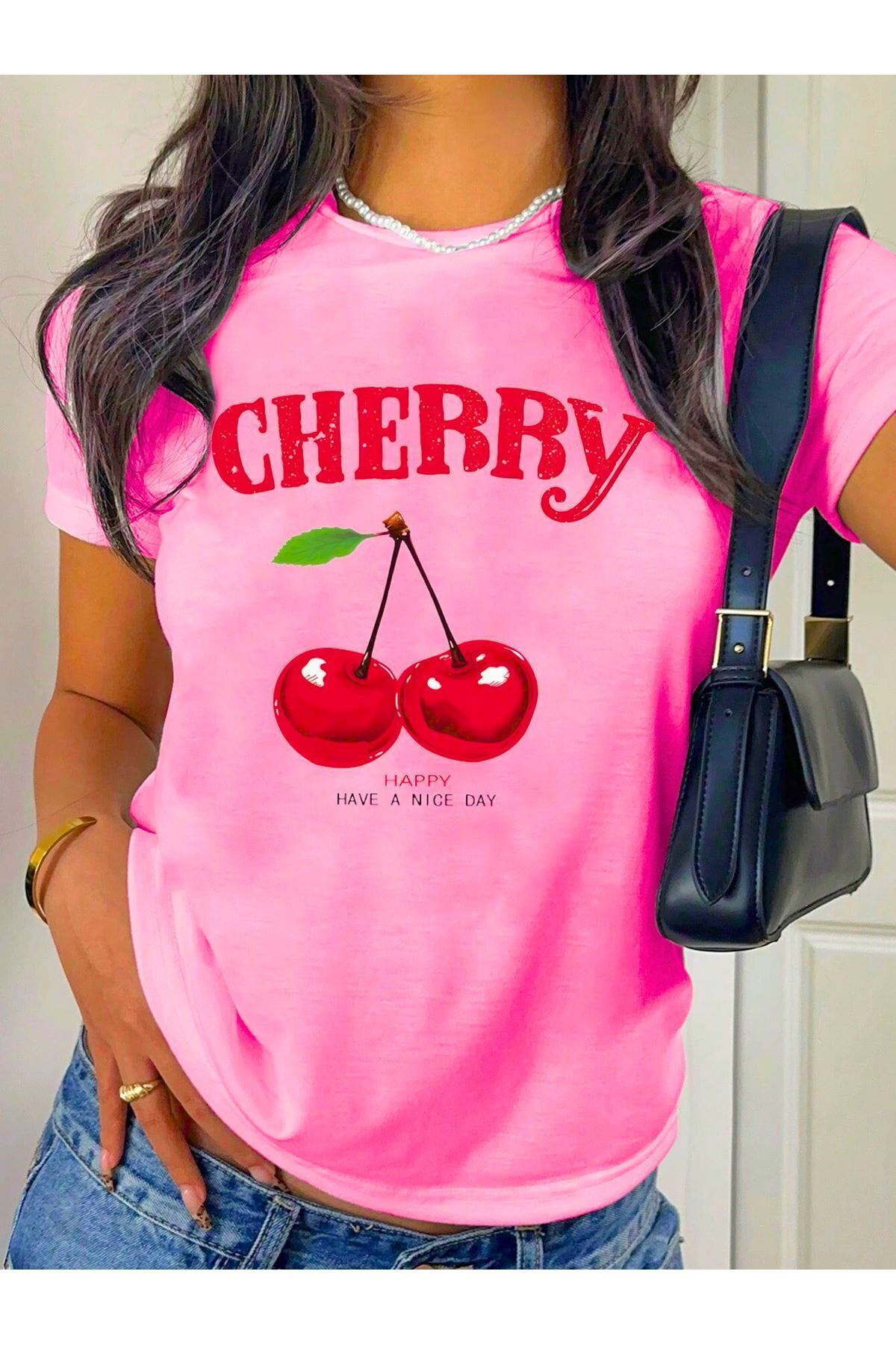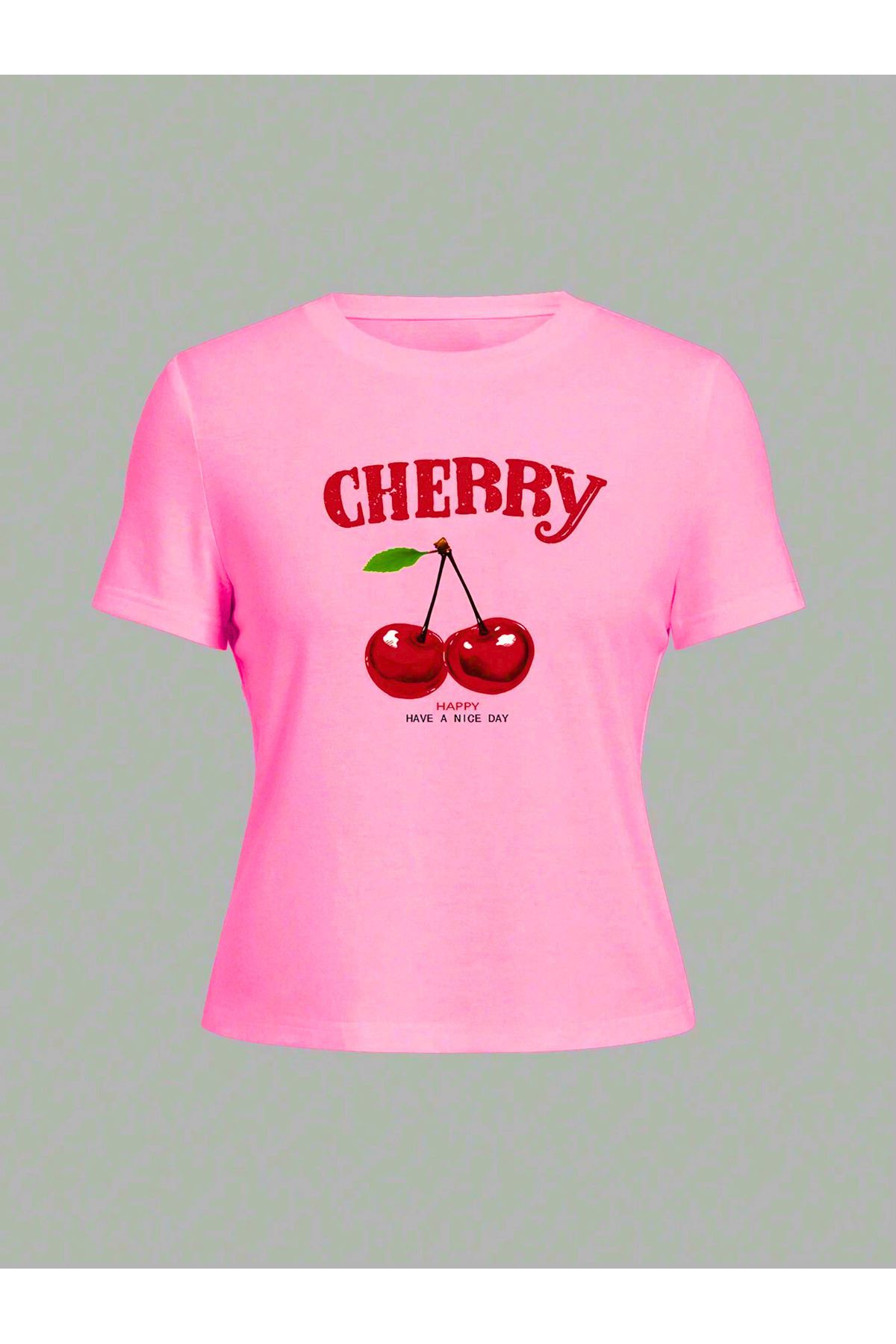Cherry Happy Baskılı Pembe Tshirt Anne Kız Kombin - Oversize Bisiklet Yaka Tişört