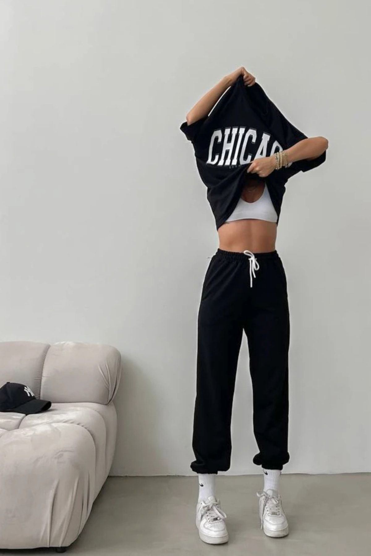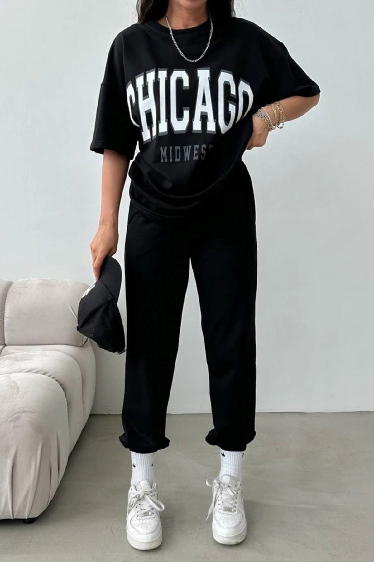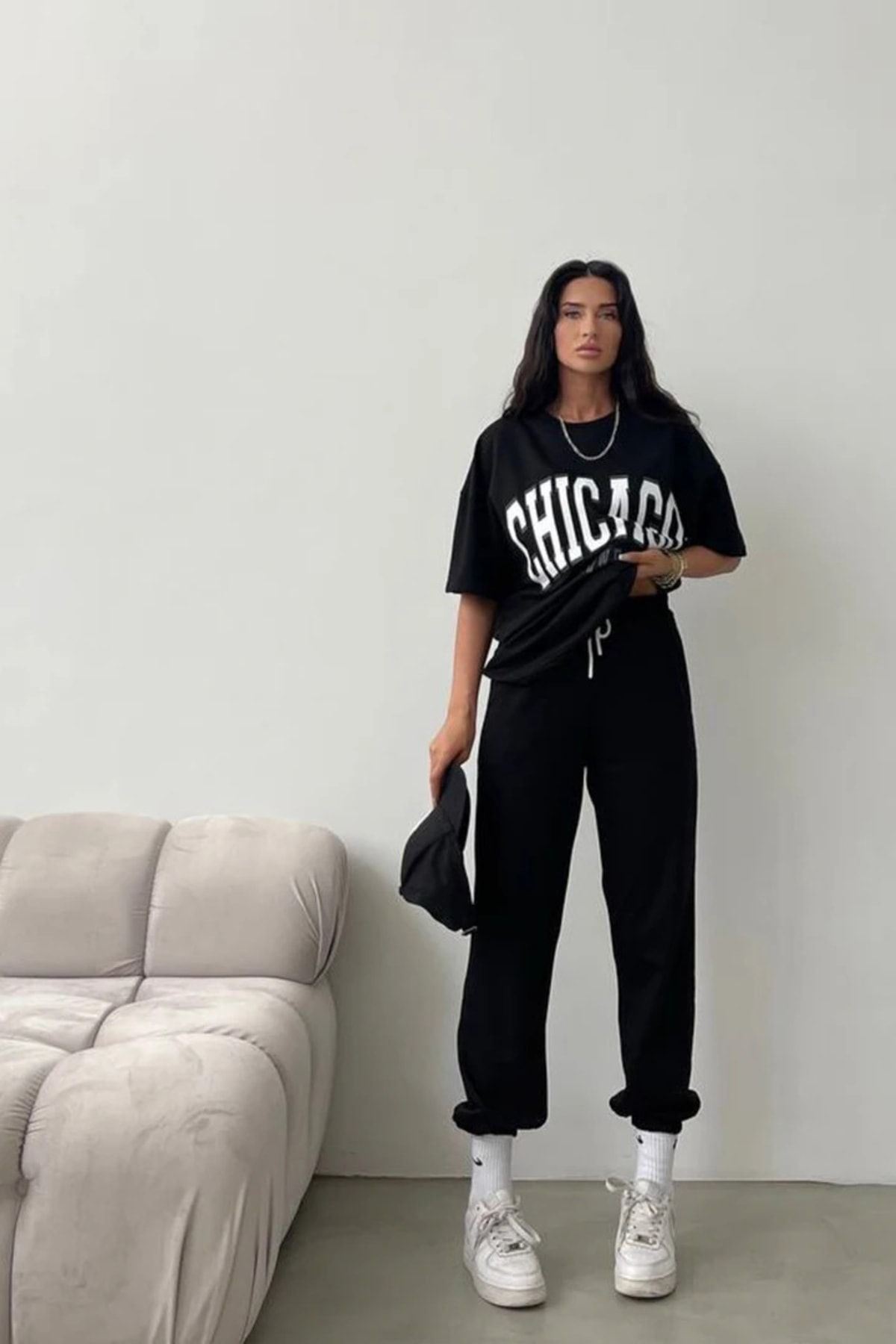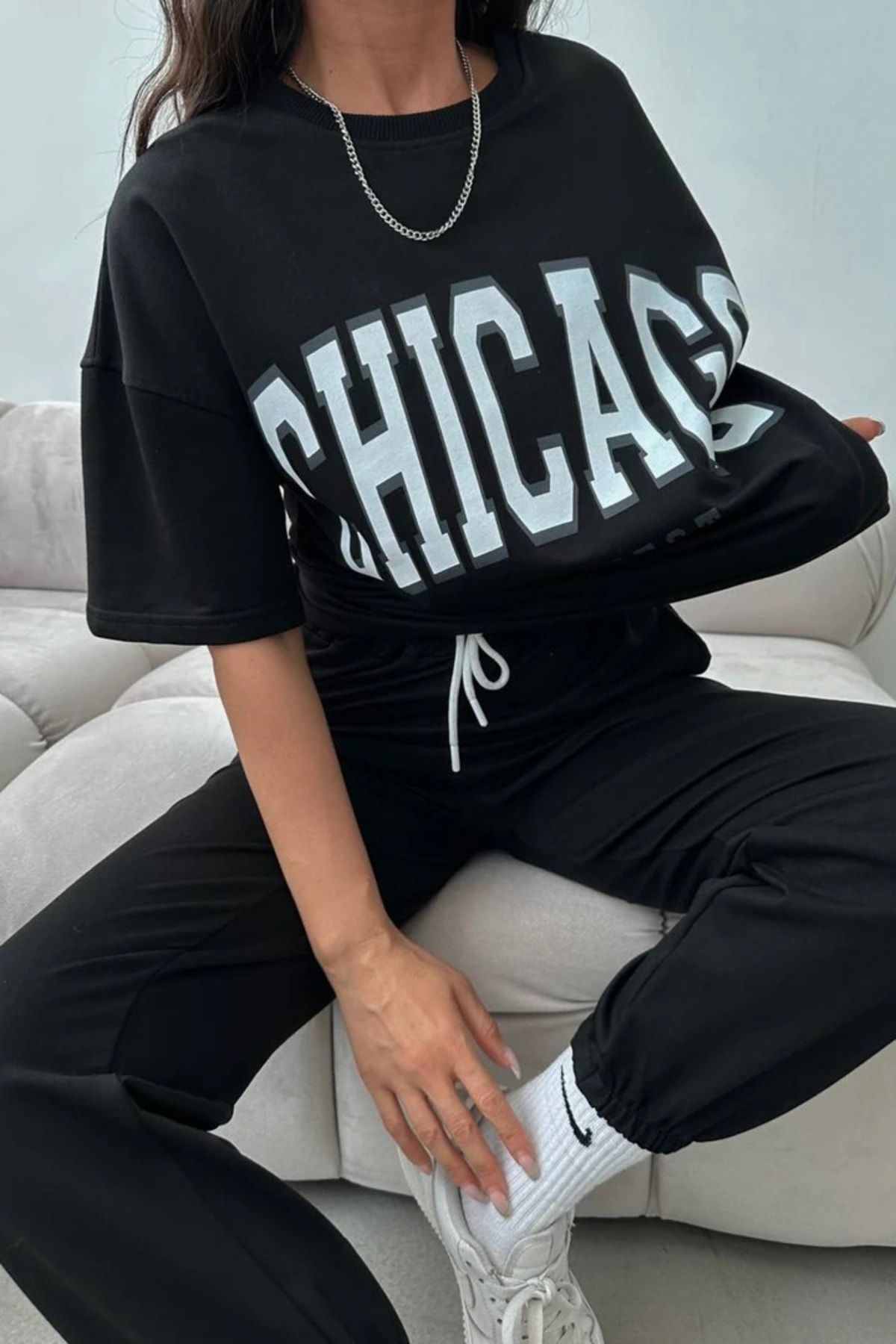 Chicago T-shirt Eşofman Altı Jogger- Siyah Baskılı Alt Üst Eşofman Takımı Oversize Bisiklet Yaka