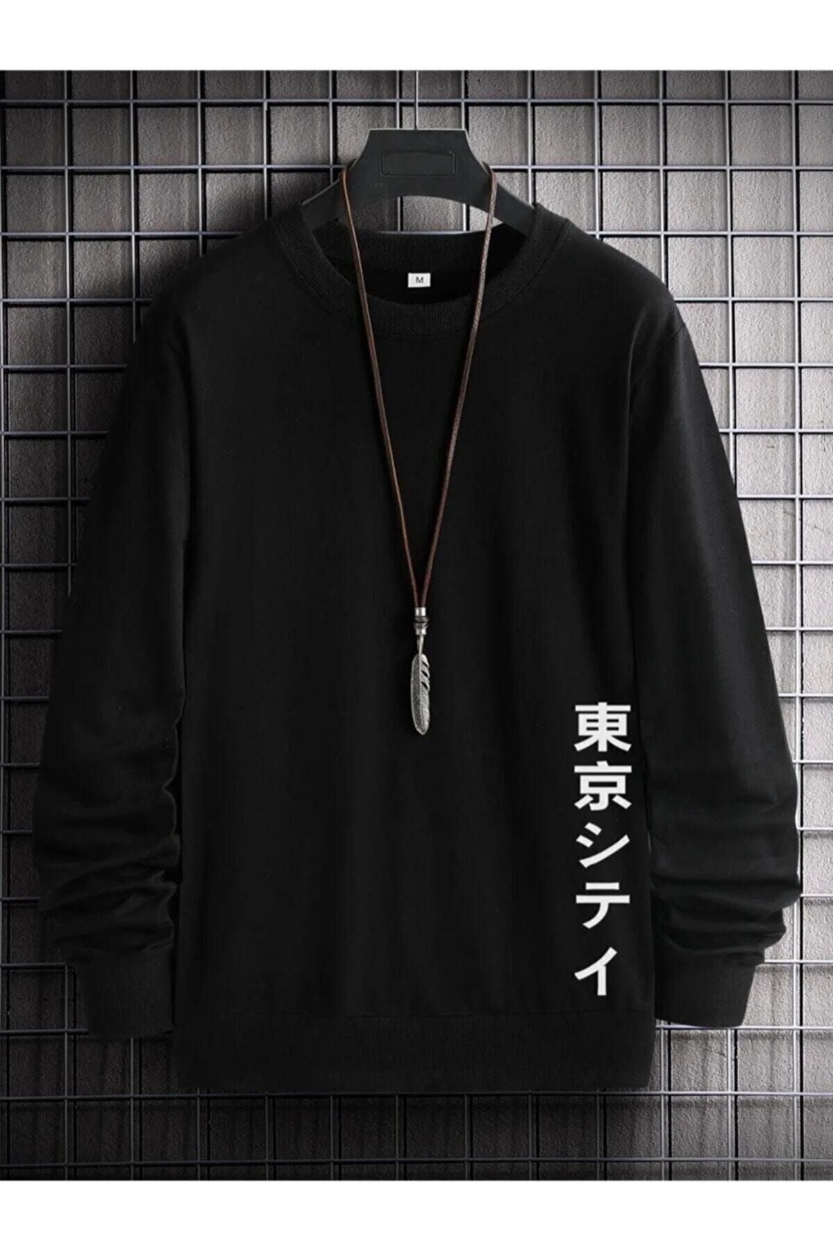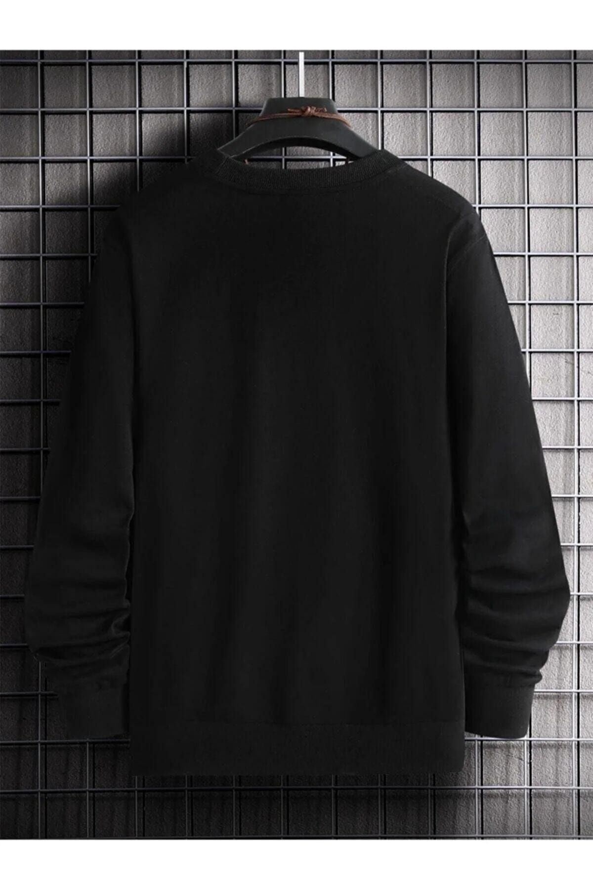 Chinese Sweatshirt - Siyah Baskılı Oversize Bisiklet Yaka