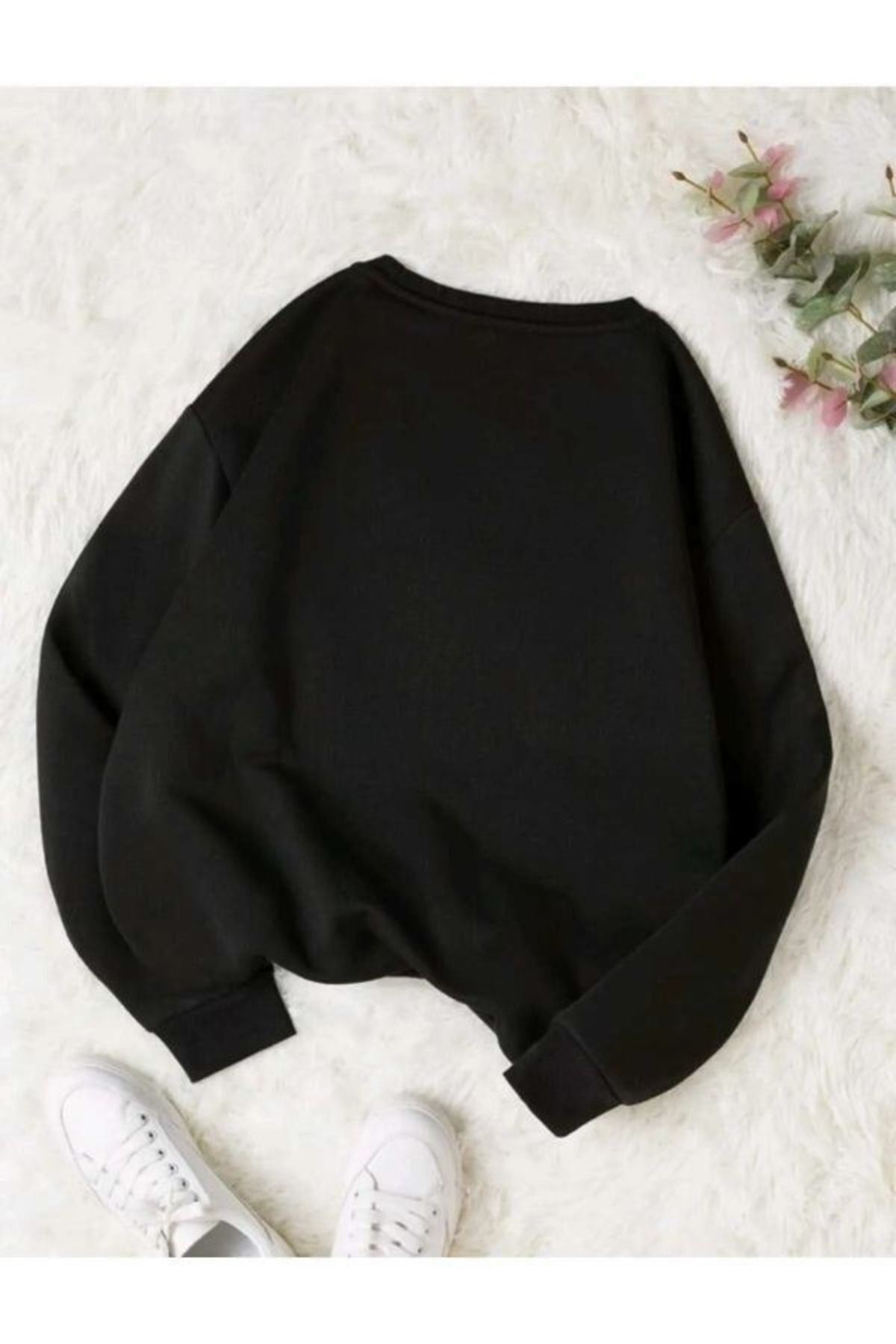 Çiçek Desen Sweatshirt - Siyah Baskılı Oversize Kalın Kışlık Bisiklet Yaka