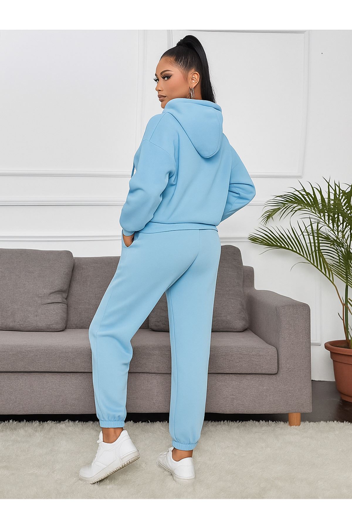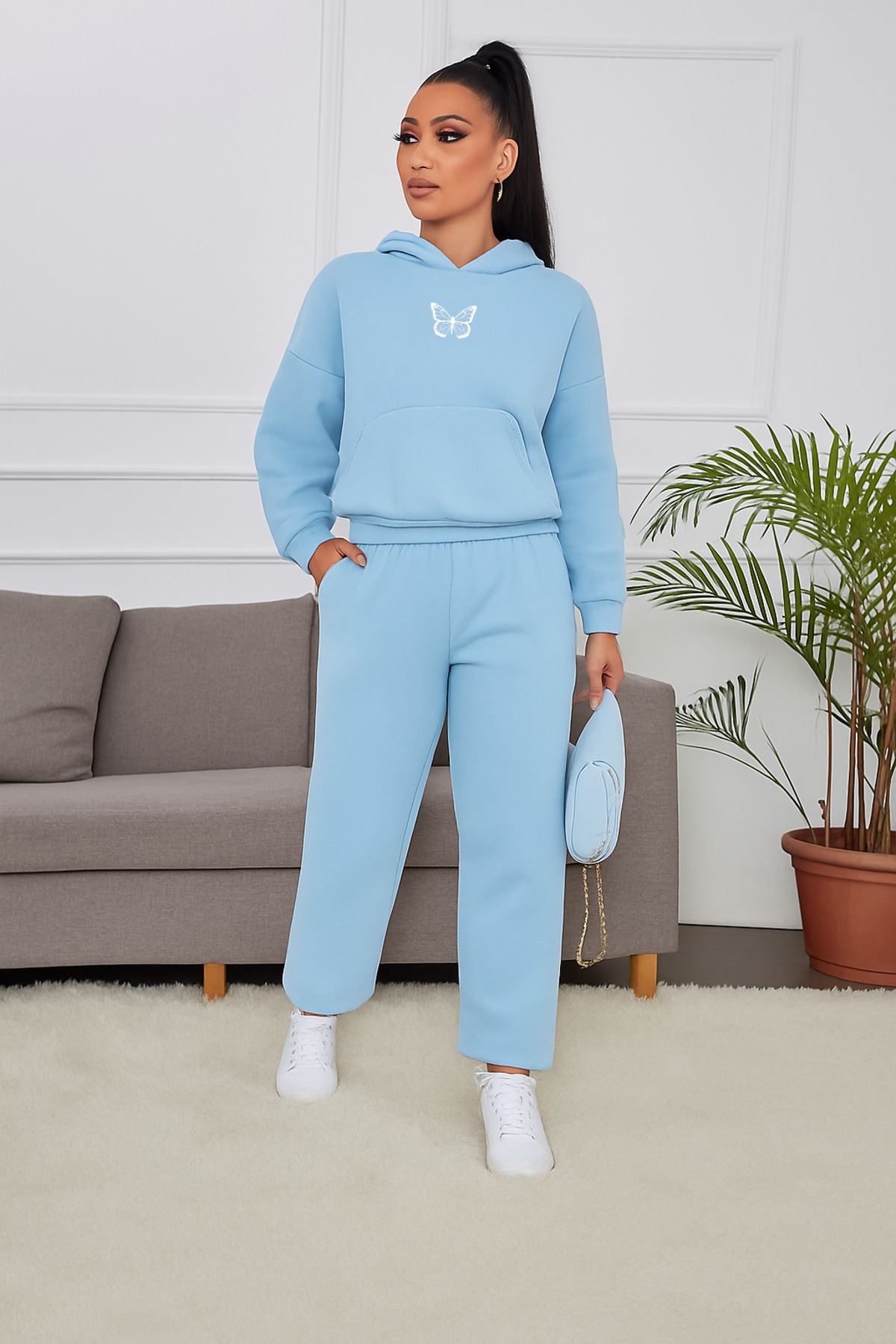 Çift Kelebek Eşofman Takımı Sweatshirt Jogger - Bebe Mavi Baskılı Oversize Şardonlu Kapüşonlu