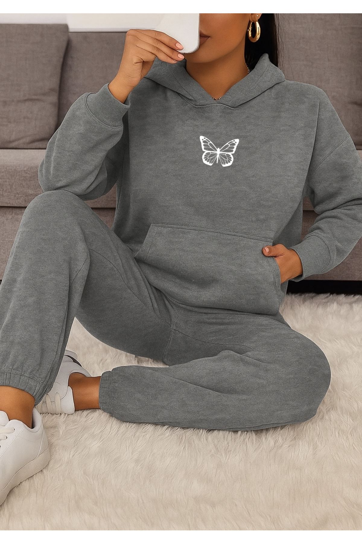Çift Kelebek Eşofman Takımı Sweatshirt Jogger - Füme Baskılı Oversize Şardonlu Kapüşonlu