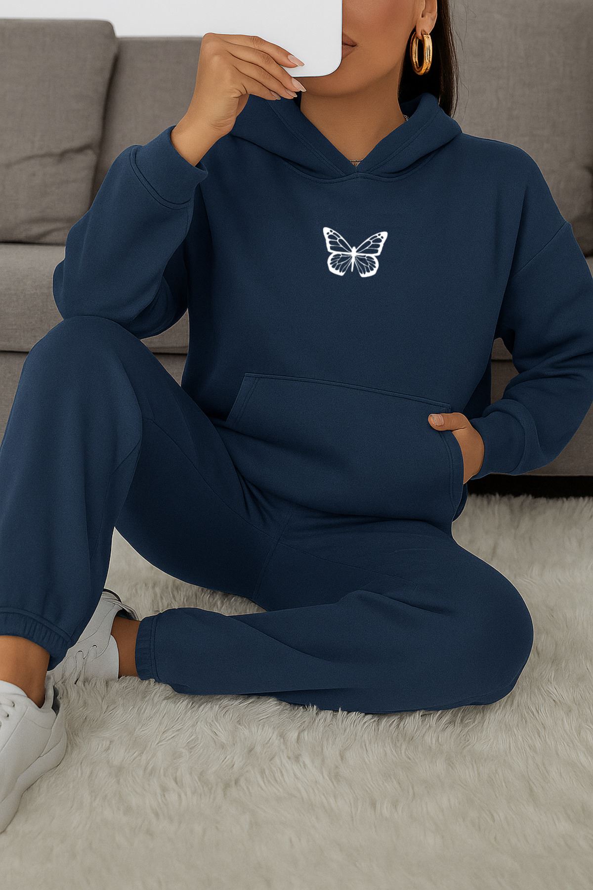 Çift Kelebek Eşofman Takımı Sweatshirt Jogger - Lacivert Baskılı Oversize Şardonlu Kapüşonlu