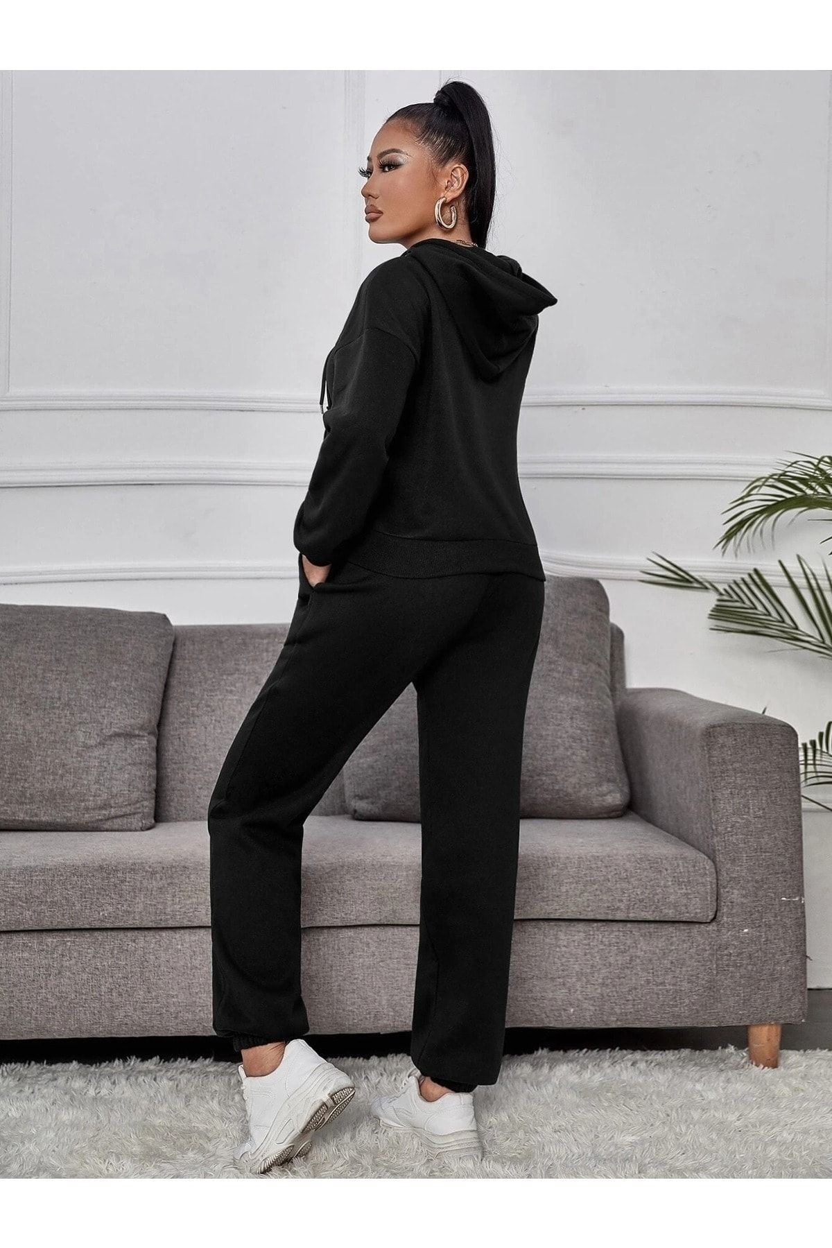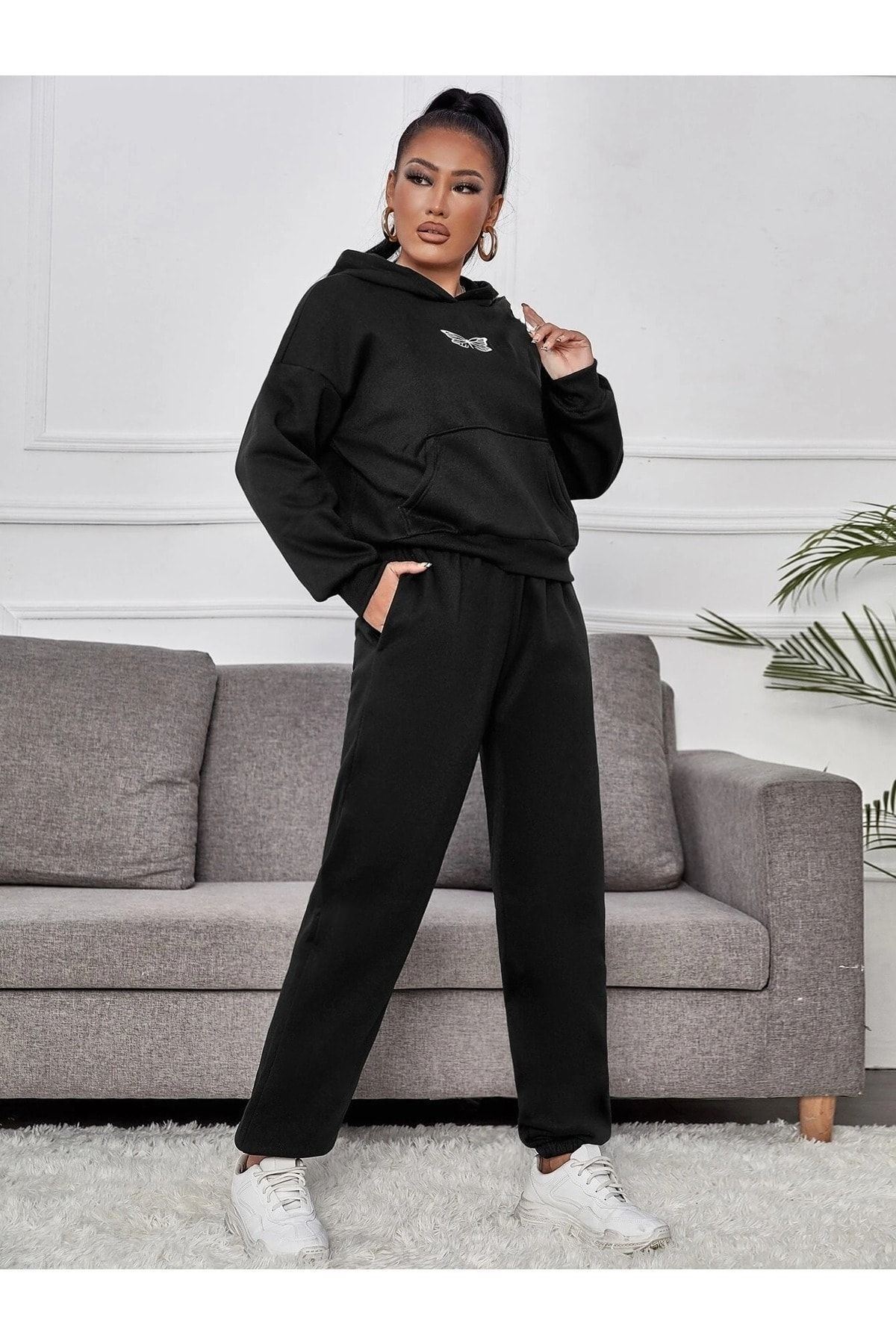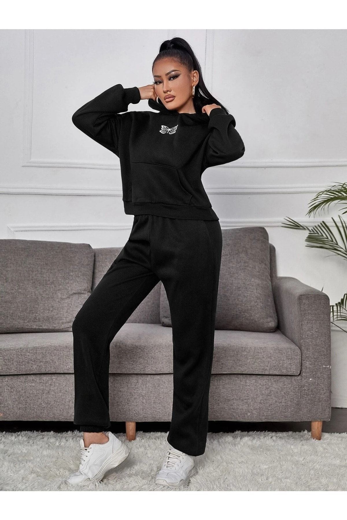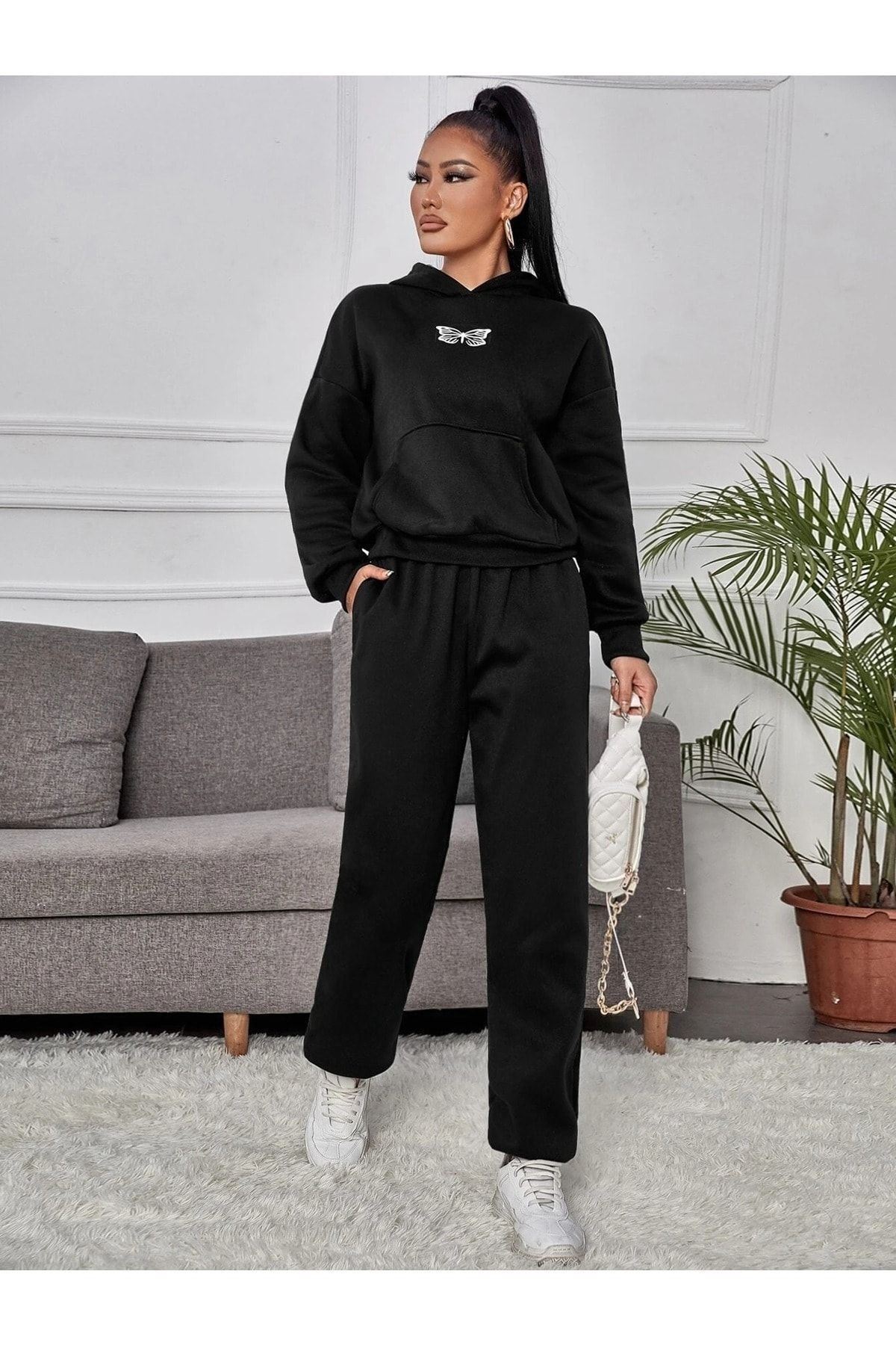 Çift Kelebek Eşofman Takımı Sweatshirt Jogger - Siyah Baskılı Oversize Şardonlu Kapüşonlu