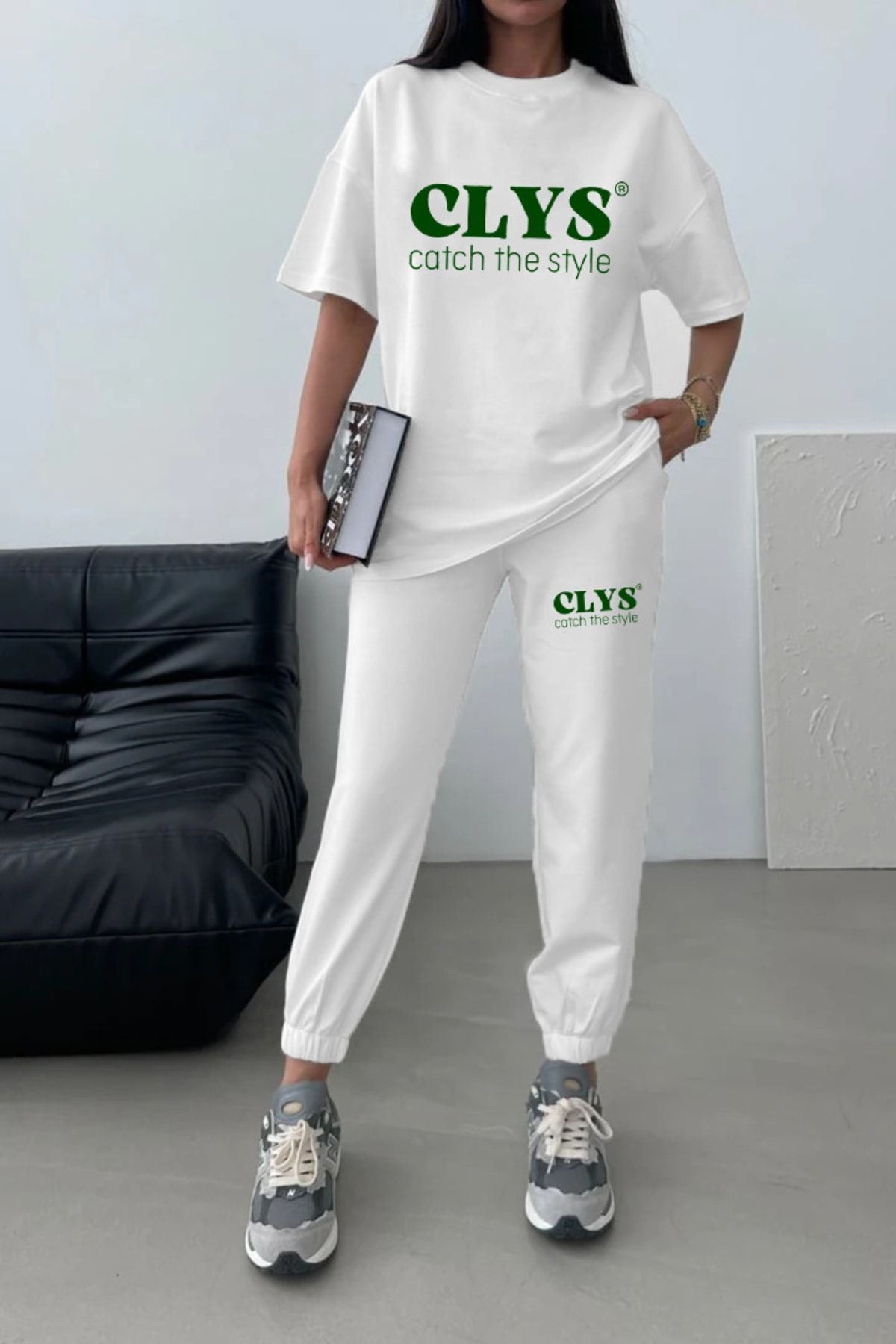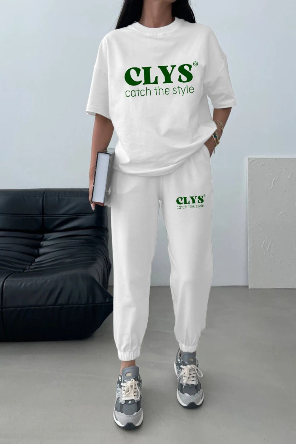 Clys Tasarım T-shirt Eşofman Altı Jogger- Beyaz Baskı Alt Üst Eşofman Takımı Oversize Bisiklet Yaka