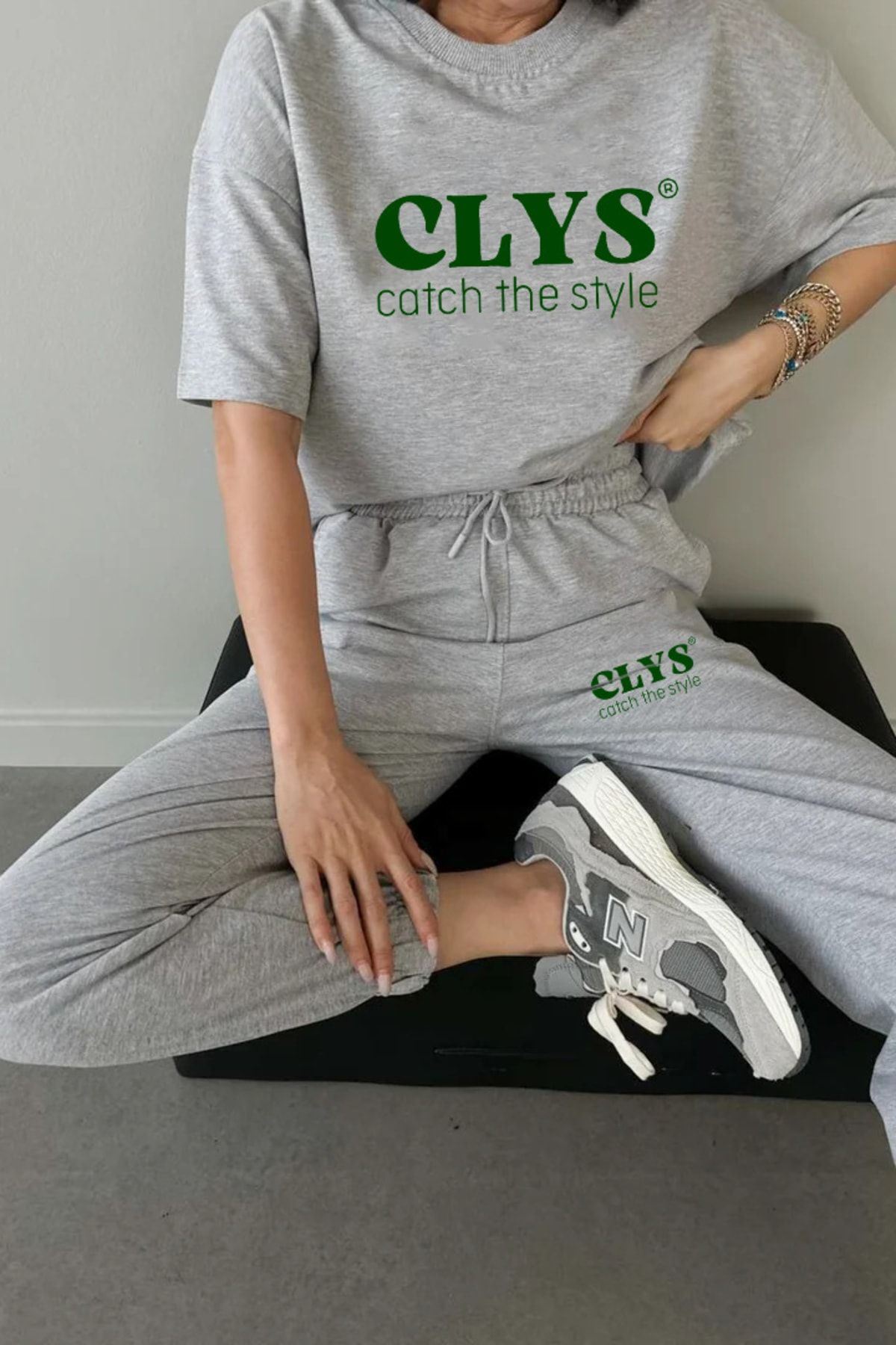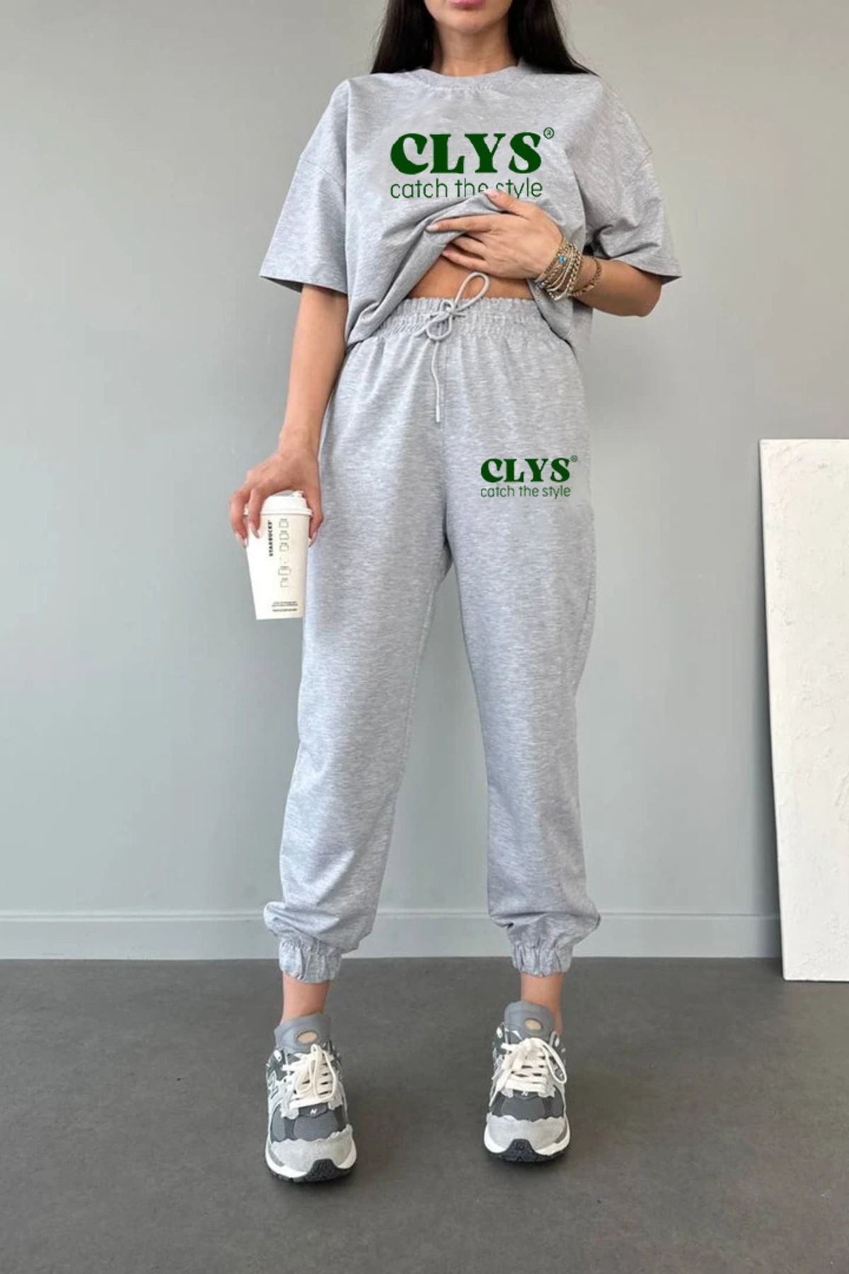 Clys Tasarım T-shirt Eşofman Altı Jogger- Gri Baskı Alt Üst Eşofman Takımı Oversize Bisiklet Yaka