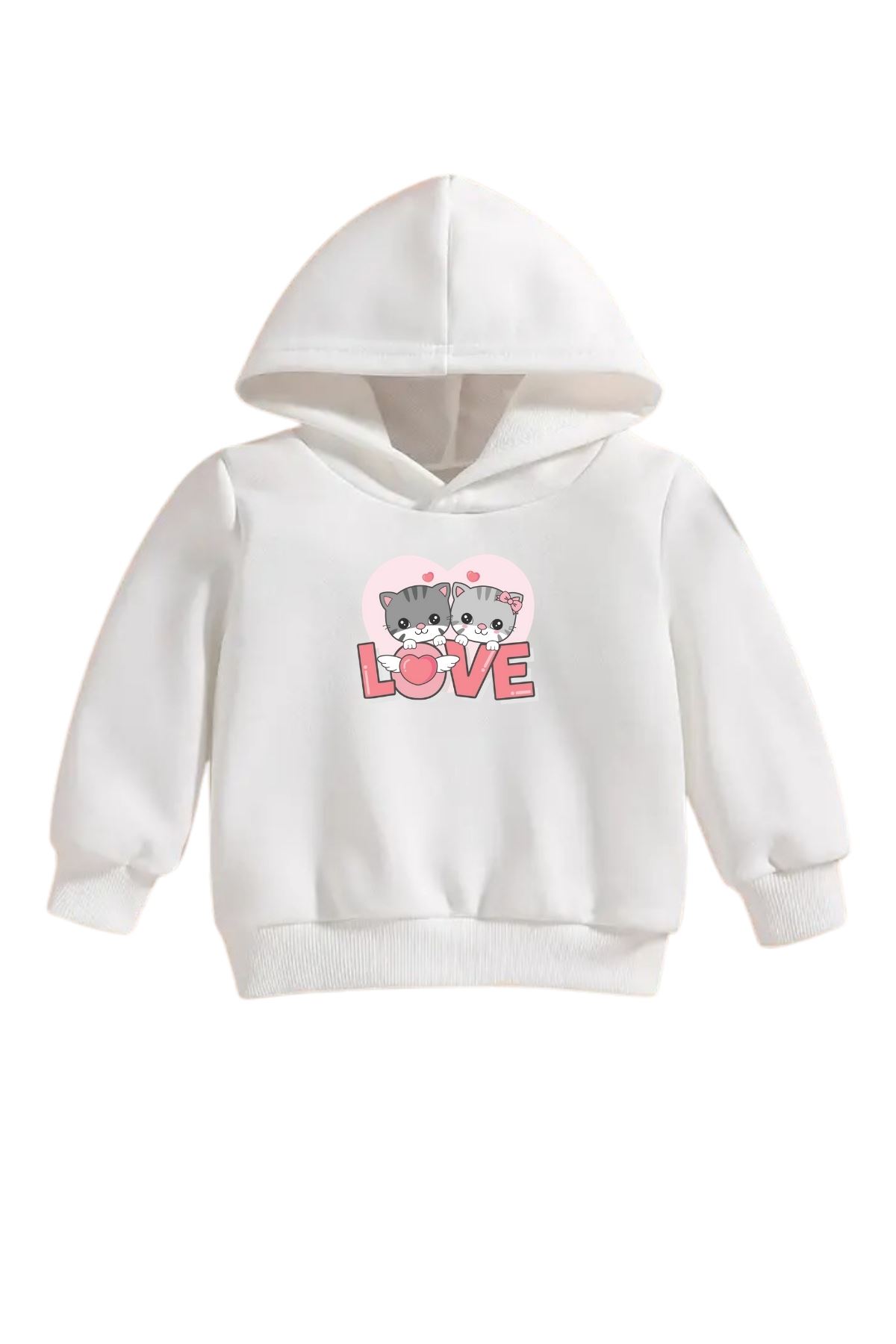 Çocuk Beyaz Kapüşonlu Sweatshirt – 2LI KEDI LOVE Baskılı, Şardonlu Kalın Kumaş