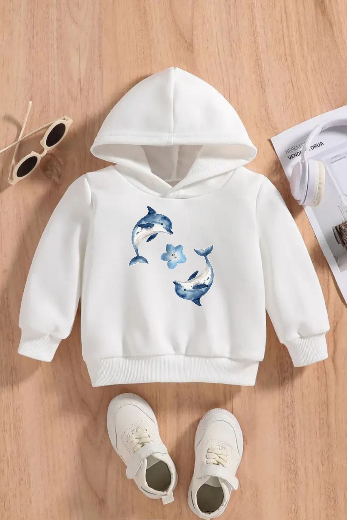 Çocuk Beyaz Kapüşonlu Sweatshirt – 2LI YUNUS Baskılı, Şardonlu Kalın Kumaş