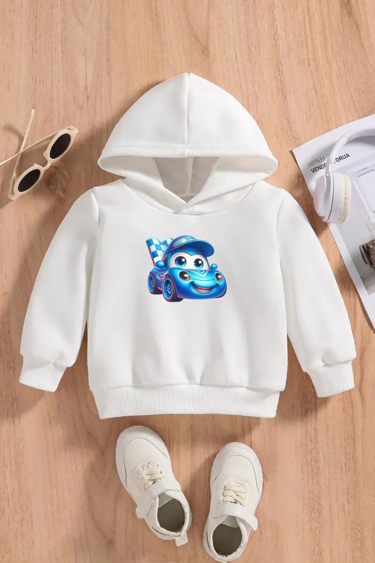 Çocuk Beyaz Kapüşonlu Sweatshirt – YARIS ARABASI Baskılı, Şardonlu Kalın Kumaş