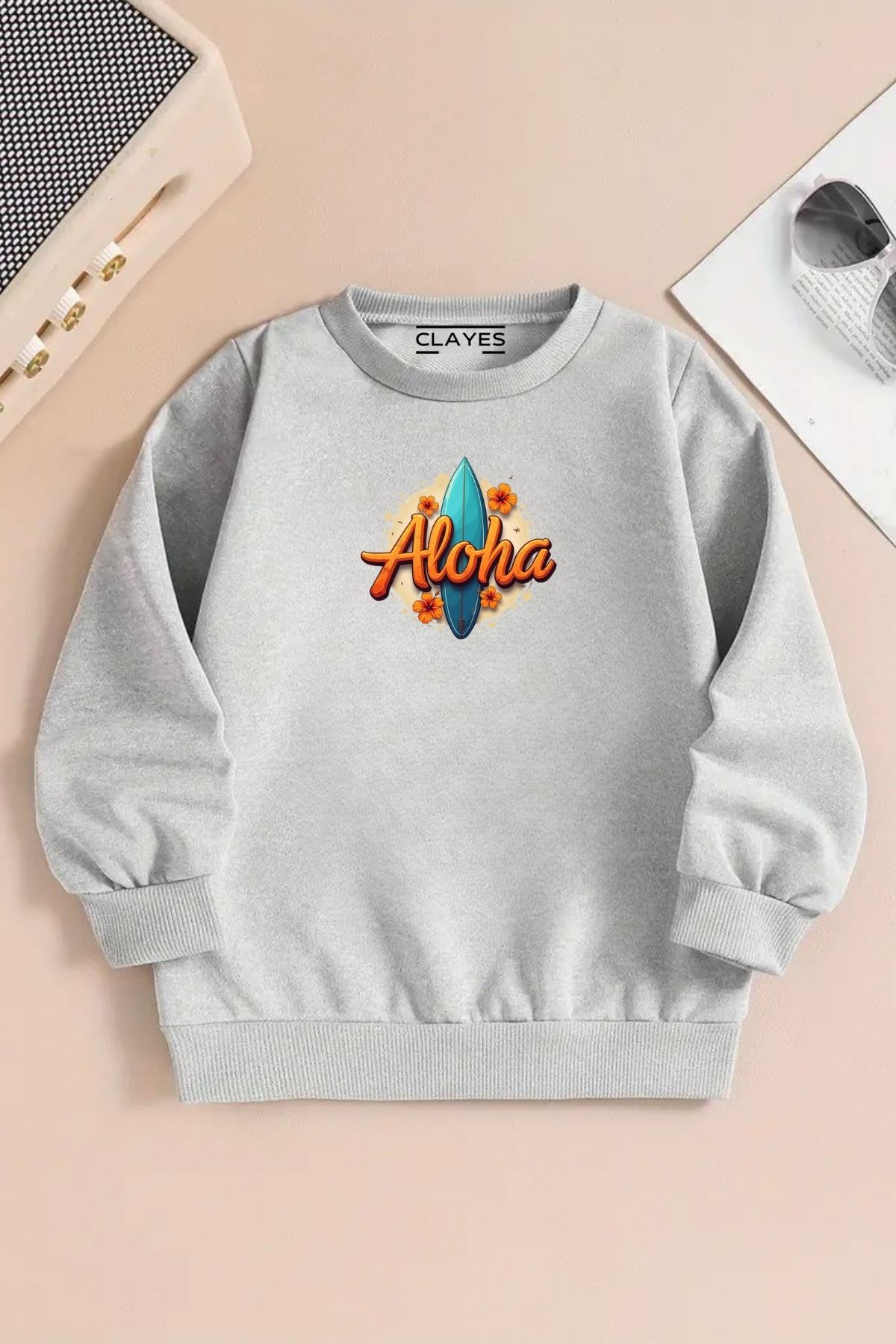 Çocuk Gri Bisiklet Yaka Sweatshirt – ALOHA Baskılı, Şardonlu Kalın Kumaş