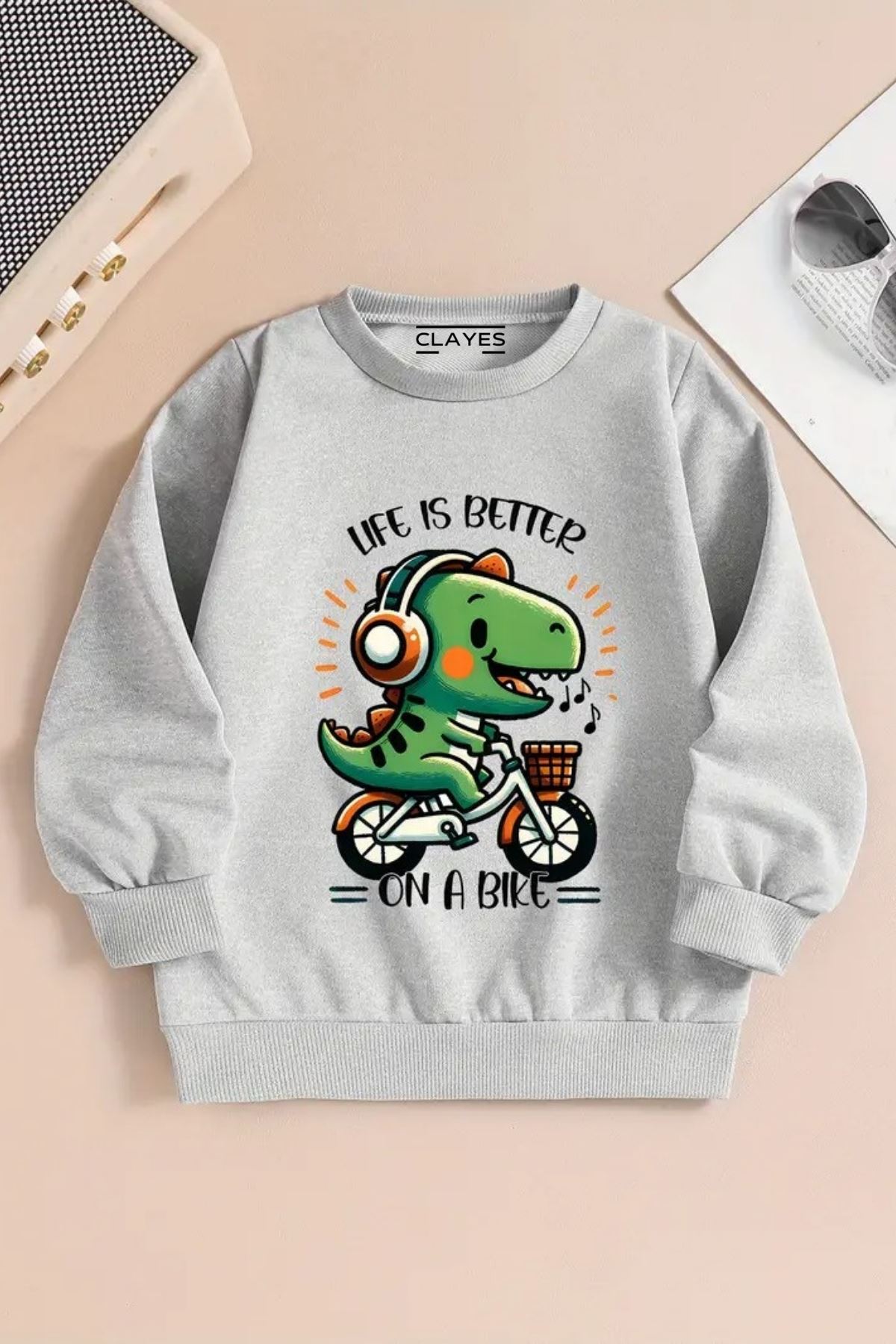 Çocuk Gri Bisiklet Yaka Sweatshirt – BİSİKLET DİNAZOR Baskılı, Şardonlu Kalın Kumaş