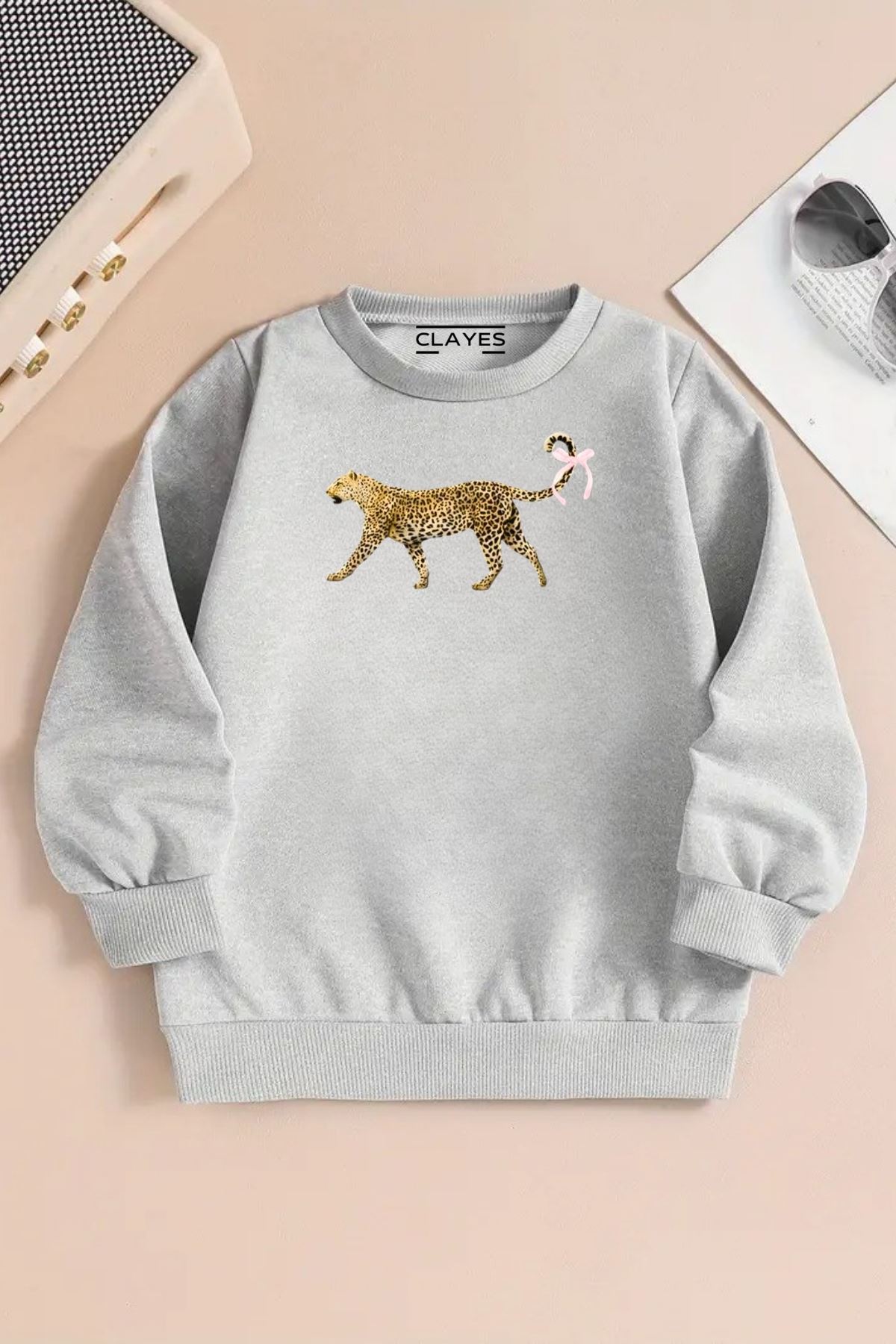 Çocuk Gri Bisiklet Yaka Sweatshirt – LEOPAR KURDELA Baskılı, Şardonlu Kalın Kumaş