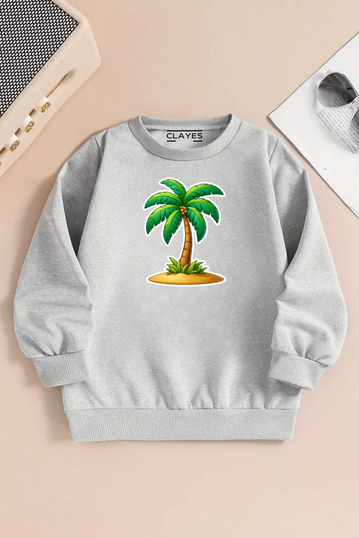 Çocuk Gri Bisiklet Yaka Sweatshirt – PALMİYE Baskılı, Şardonlu Kalın Kumaş