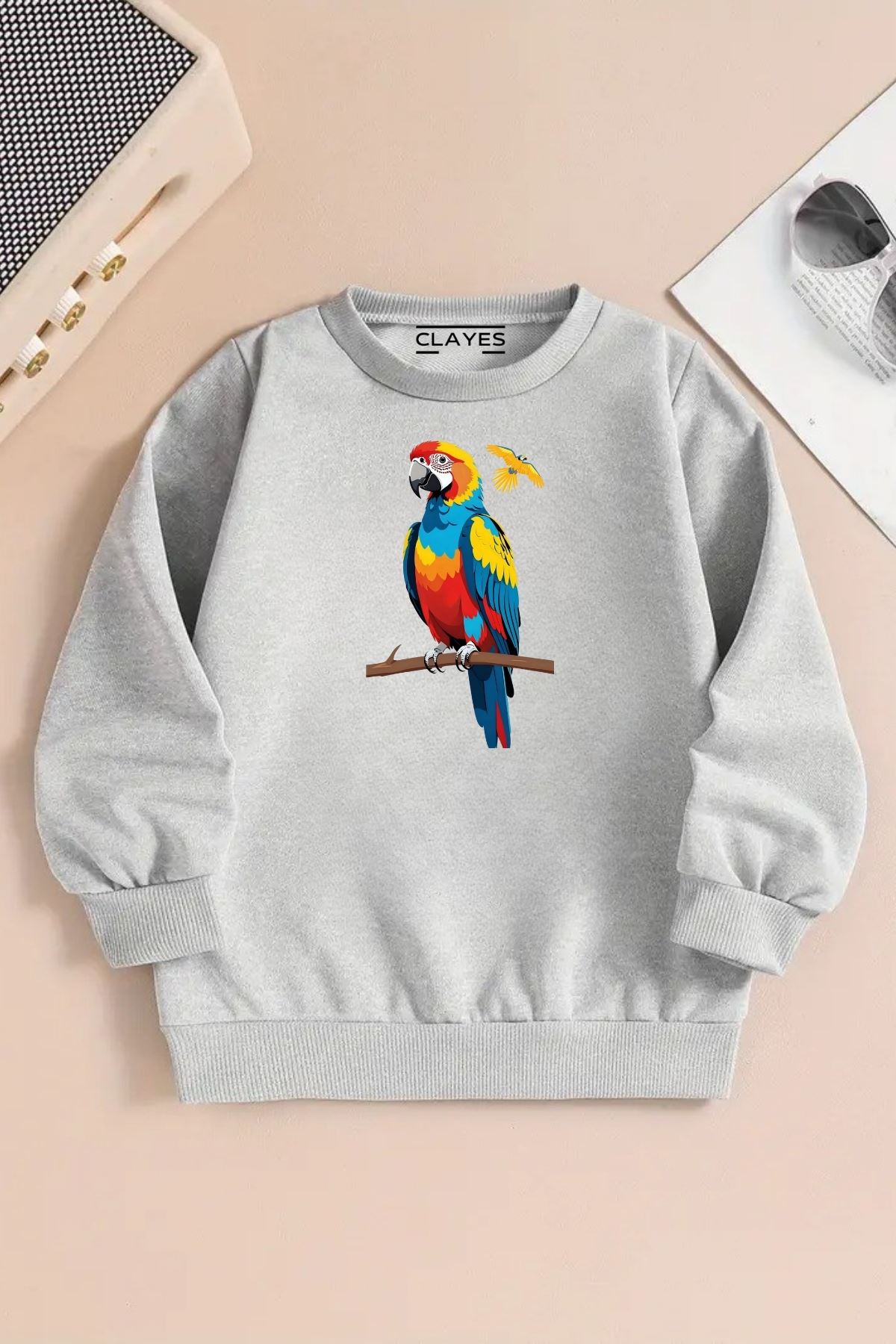 Çocuk Gri Bisiklet Yaka Sweatshirt – PAPAĞAN Baskılı, Şardonlu Kalın Kumaş