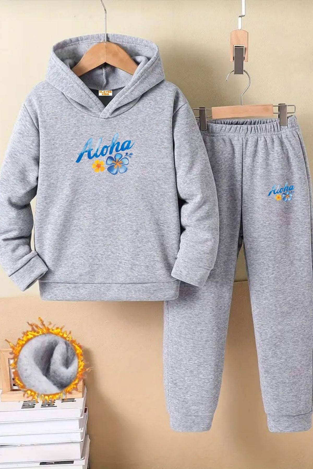 Çocuk Gri Kapüşonlu Eşofman Takımı Şardonlu Kumaş Kışlık İkili Set - Aloha Mavi Çiçek Baskılı