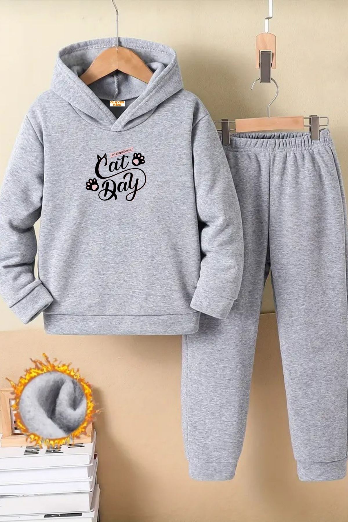 Çocuk Gri Kapüşonlu Eşofman Takımı Şardonlu Kumaş Kışlık İkili Set - Cat Day Baskılı