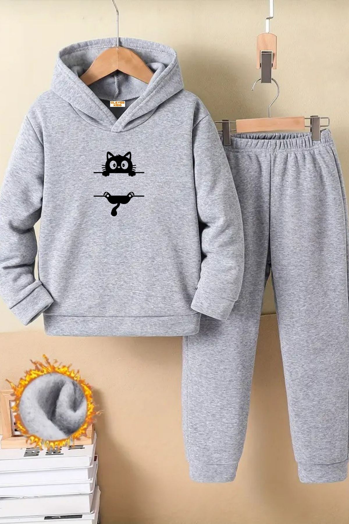 Çocuk Gri Kapüşonlu Eşofman Takımı Şardonlu Kumaş Kışlık İkili Set - Çizgi Kedi Baskılı