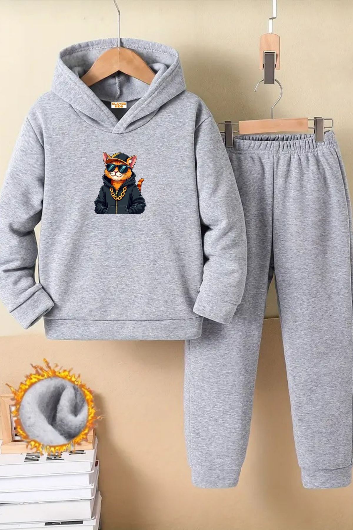 Çocuk Gri Kapüşonlu Eşofman Takımı Şardonlu Kumaş Kışlık İkili Set - Gözlüklü Kedi Baskılı